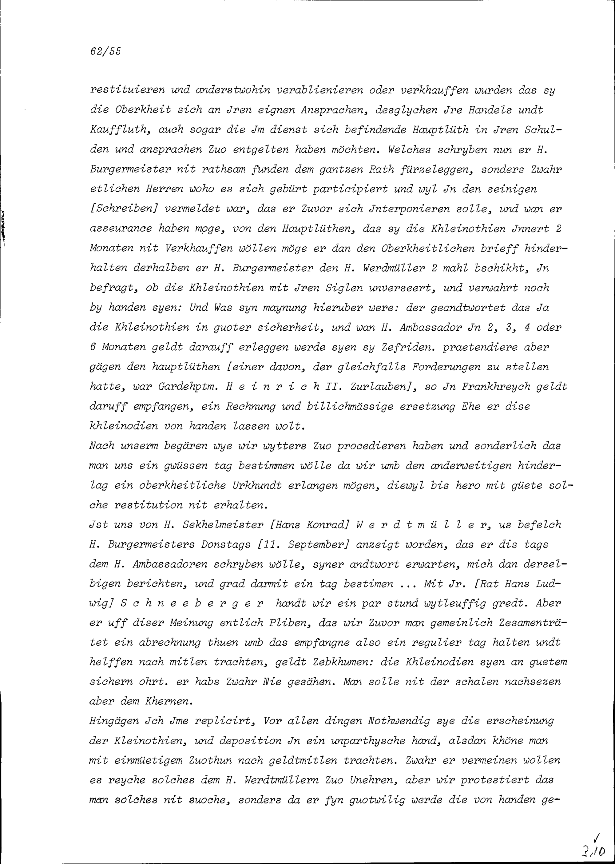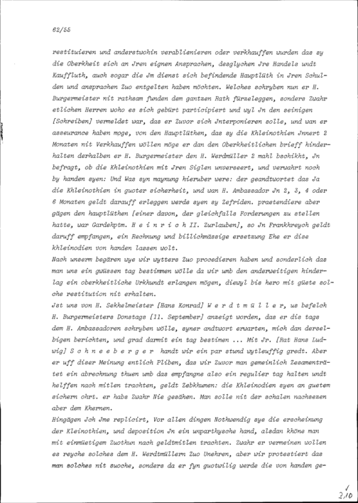 Notiz von Beat II. Zurlauben über die in Zürich geführten Verhandlungen in Zusammenhang mit dem Kleinodienstreit