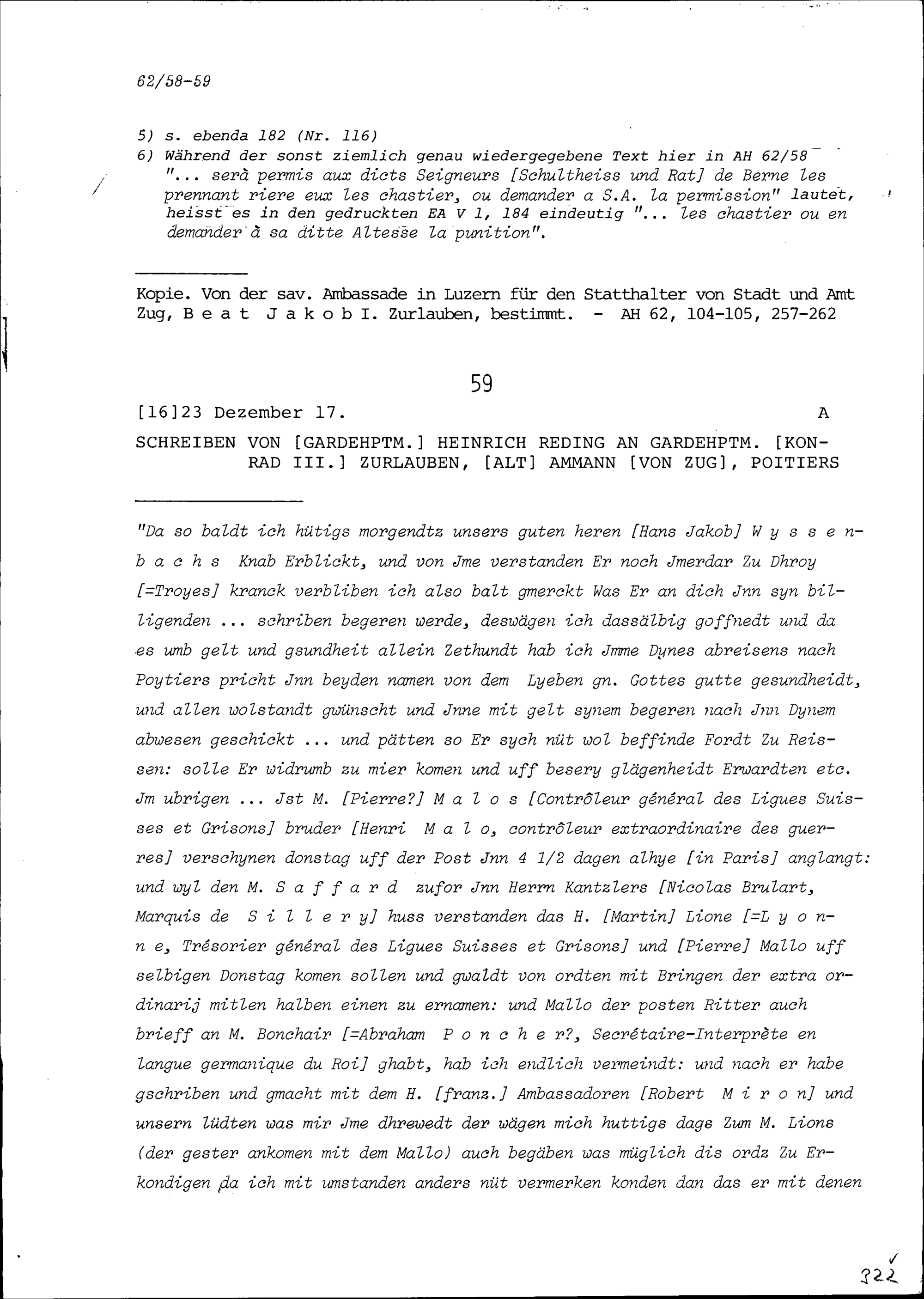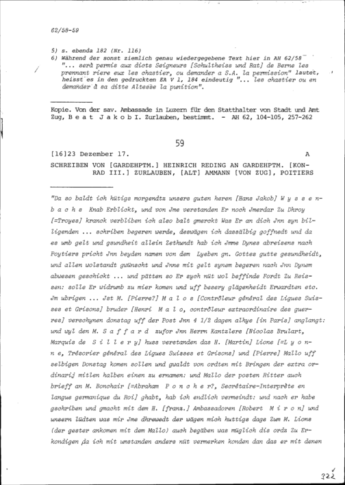 Schreiben von Heinrich Reding, Gardehauptmann, an Konrad III. Zurlauben, Gardehauptmann, Altammann von Zug, Poitiers