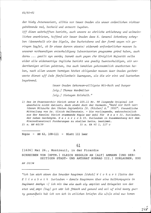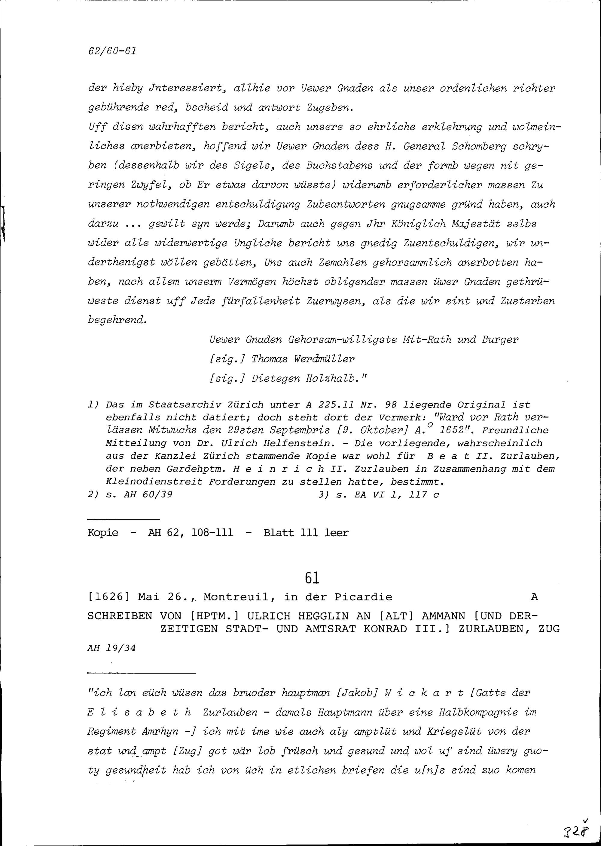 Schreiben von Ulrich Hegglin, Hauptmann, an Konrad III. Zurlauben, Altammann und Stadt- und Amtrat, Zug