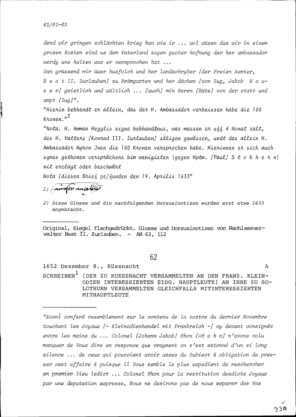 Schreiben der an den französischen Kleinodien interessierten eidgenössischen Hauptleute in Küssnacht am Rigi an ihre gleichfalls mitinteressierten Mithauptleute in Solothurn