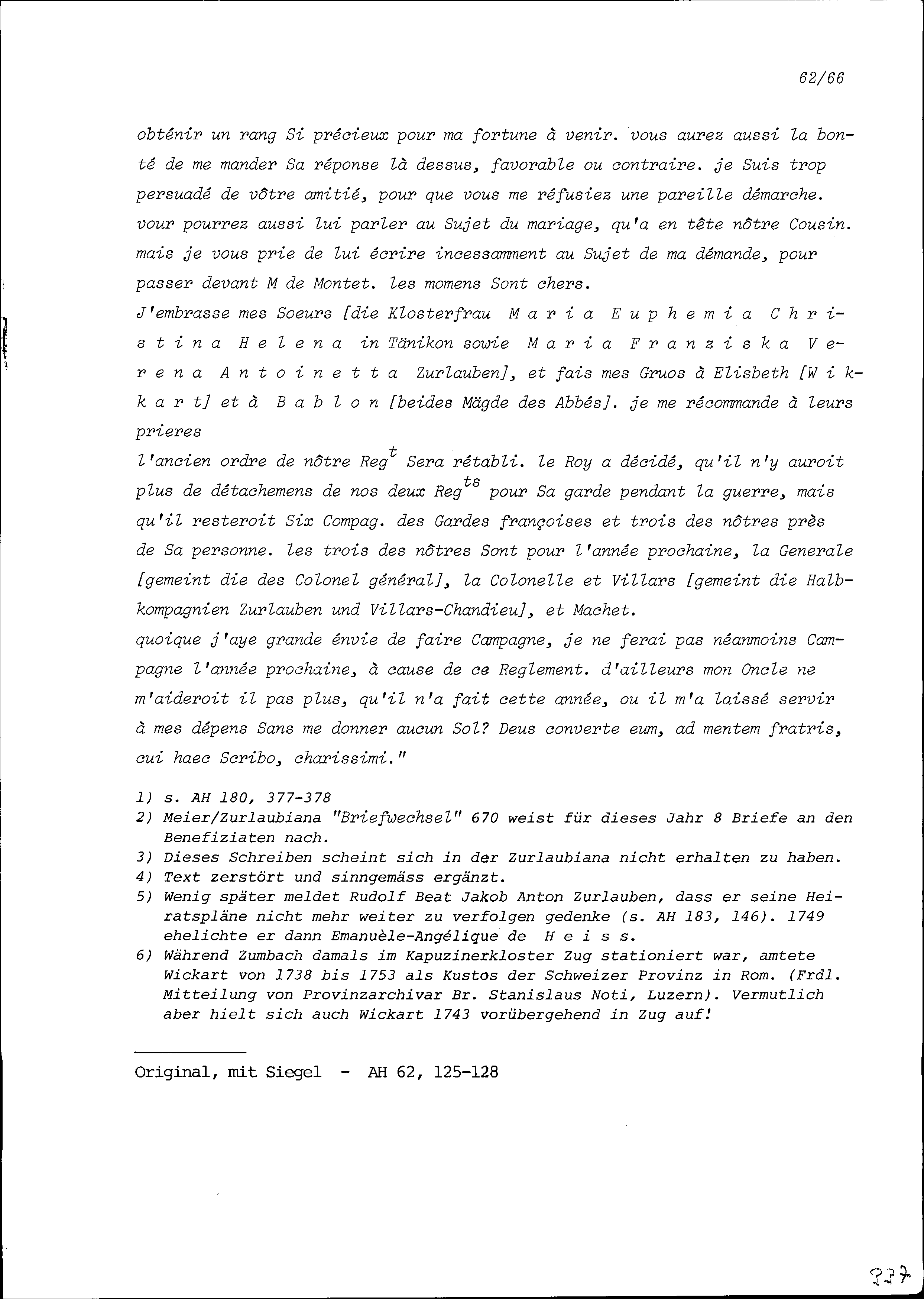 Schreiben von Beat Fidel Zurlauben, Gardeleutnant, an Beat Jakob Anton Zurlauben, Priester, Zug