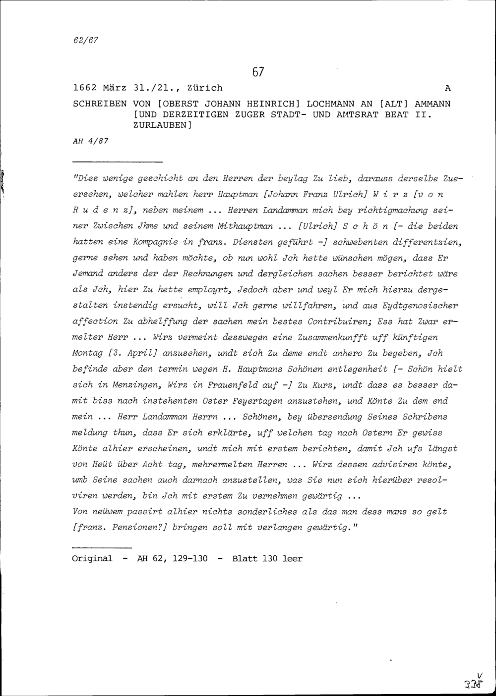 Schreiben von Johann Heinrich Lochmann, Oberst, an Beat II. Zurlauben, Altammann...
