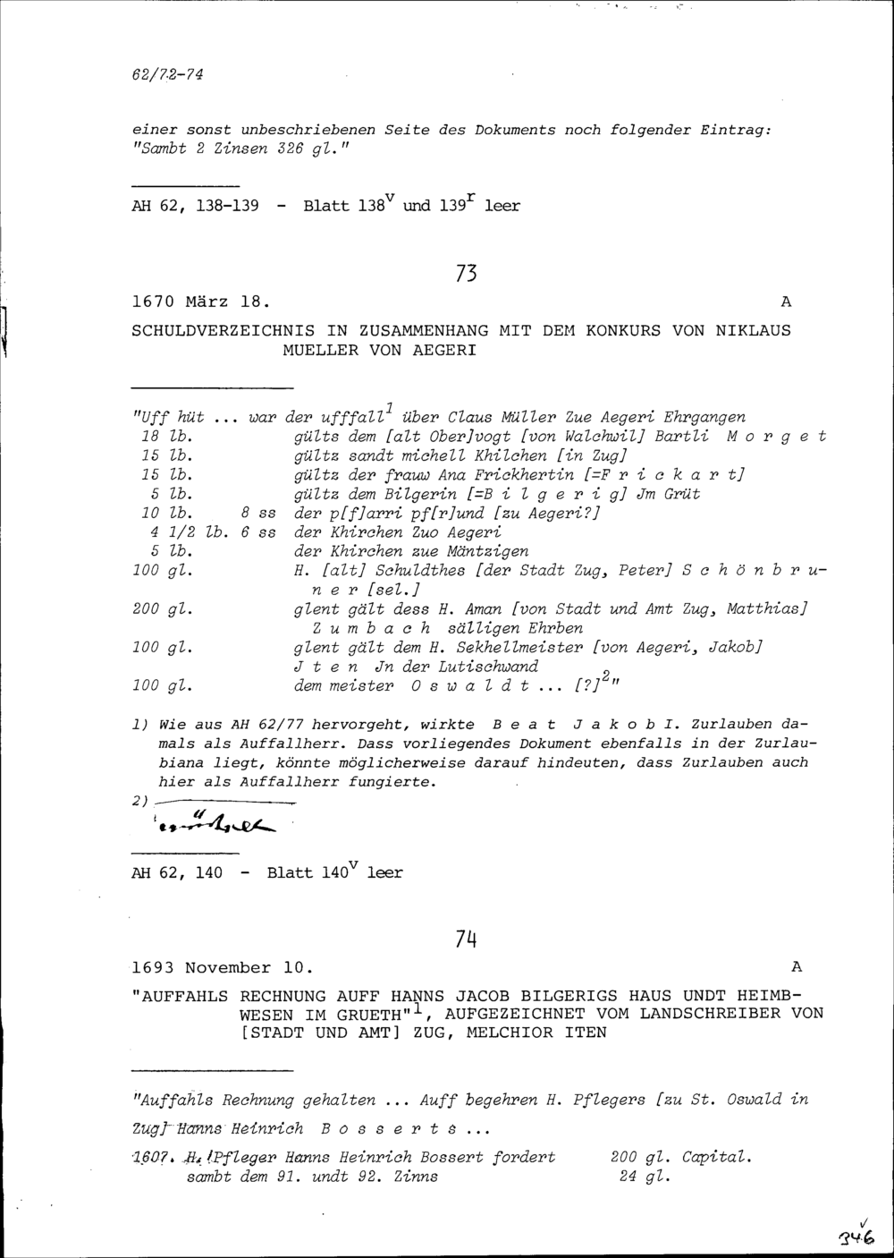 Schuldverzeichnis in Zusammenhang mit dem Konkurs von Niklaus Müller von Ägeri