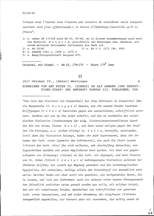 Schreiben von Peter II. Schmid, Abt von Wettingen, an Konrad III. Zurlauben, Altammann...