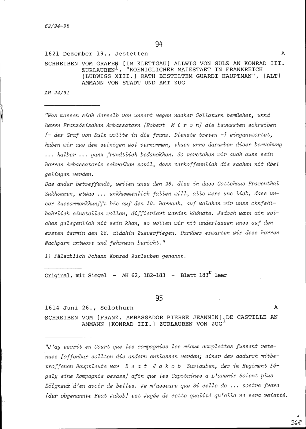 Schreiben von Allwig von Sulz, Graf im Klettgau, an Konrad III. Zurlauben, Altammann...