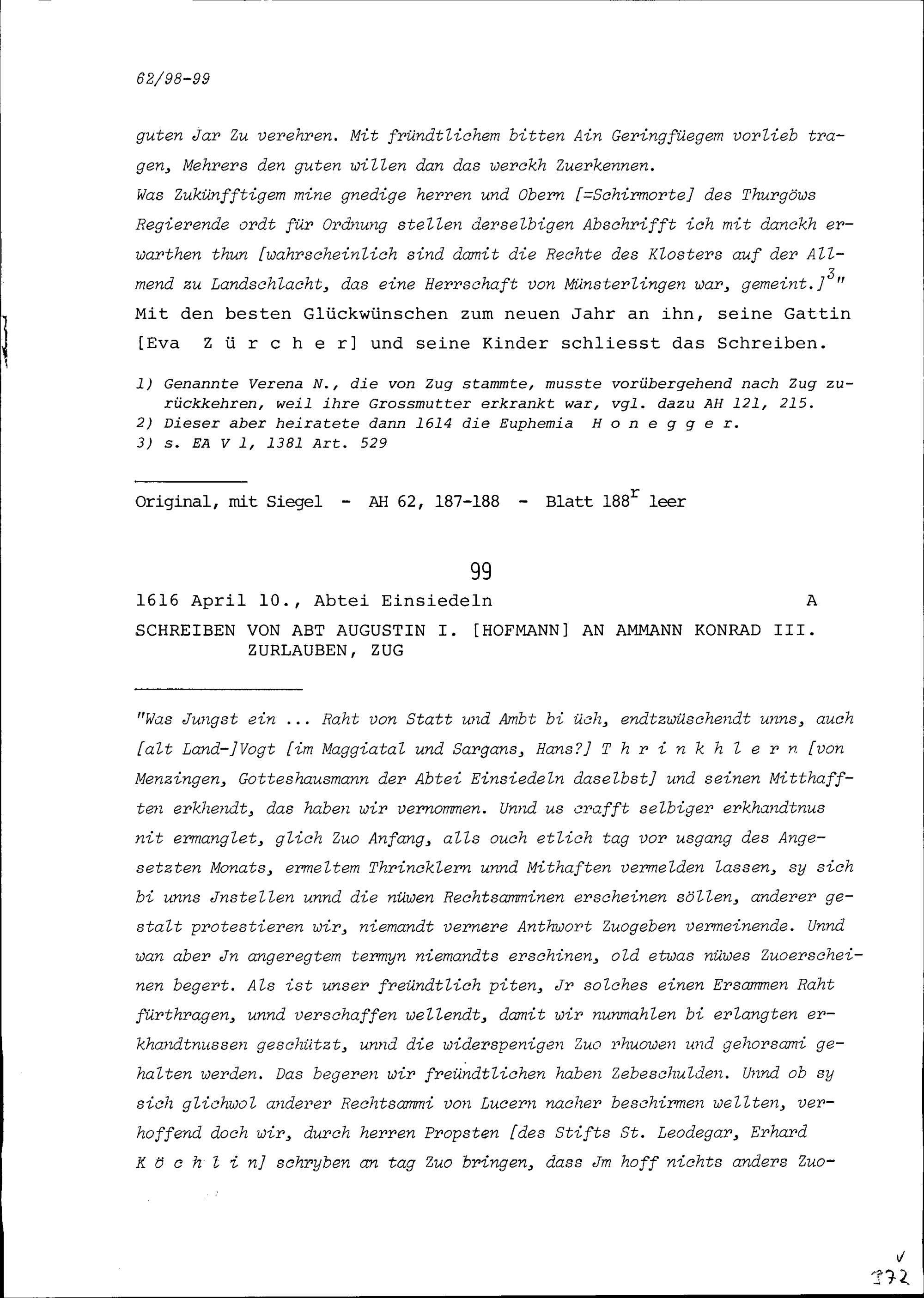 Schreiben von Augustin I. Hofmann, Abt von Einsiedeln, an Konrad III. Zurlauben, Ammann, Zug