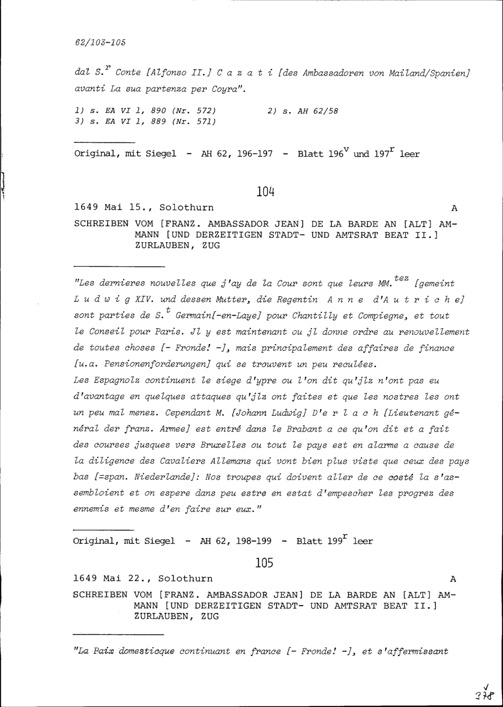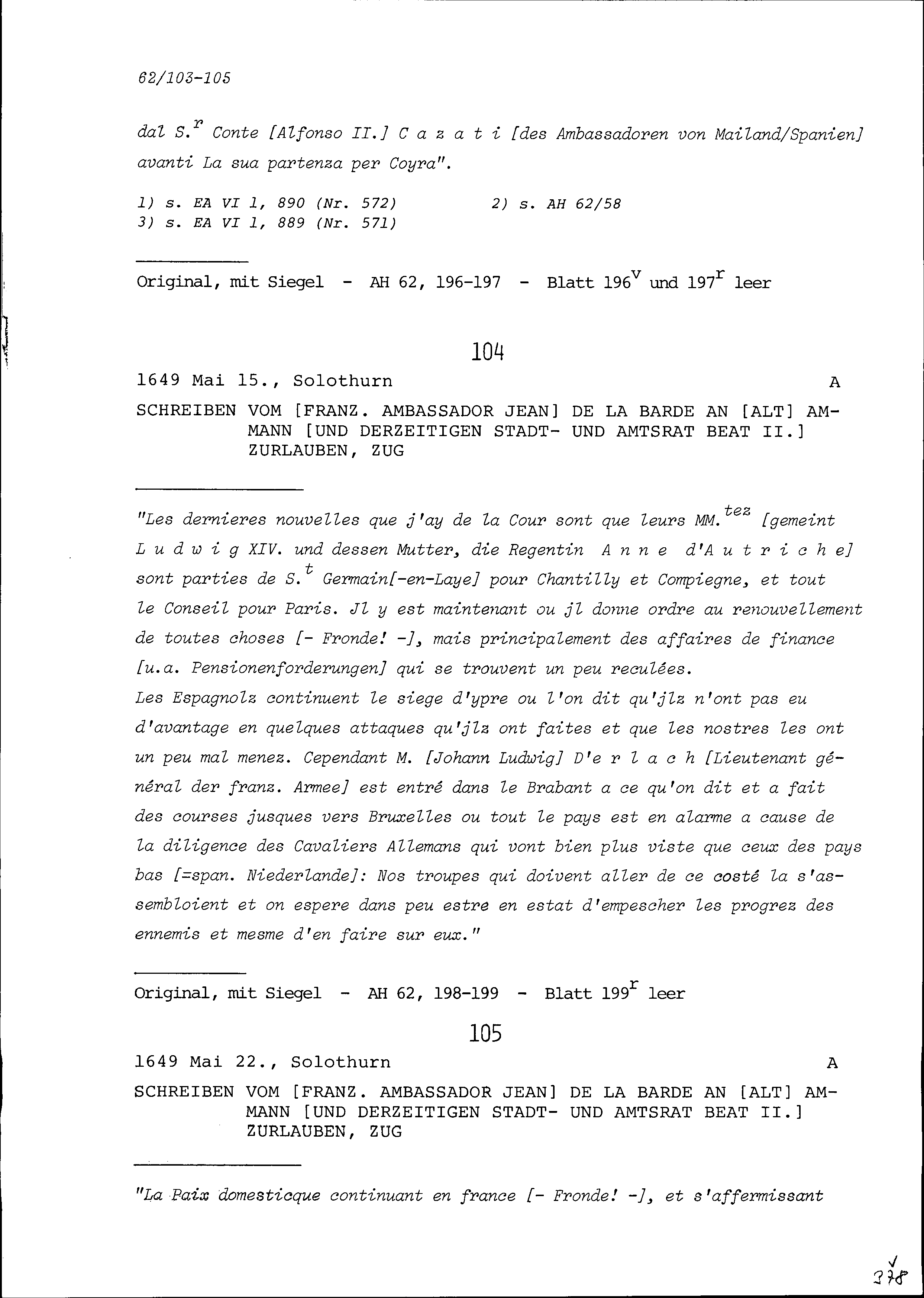 Schreiben von Jean de la Barde, Ambassador von Frankreich, an Beat II. Zurlauben,...