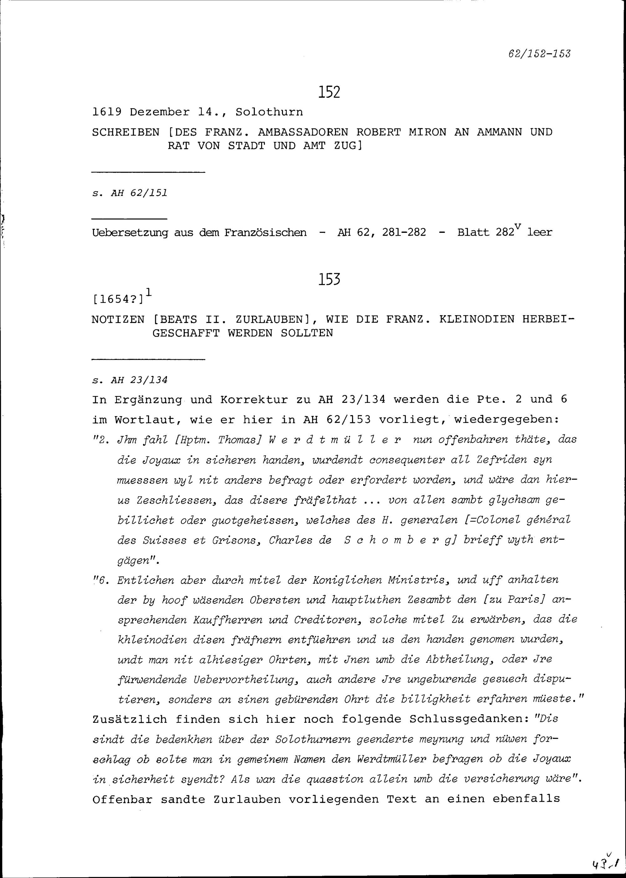 Schreiben von Robert Miron, Ambassador von Frankreich, an Ammann und Rat von Stadt und Amt Zug