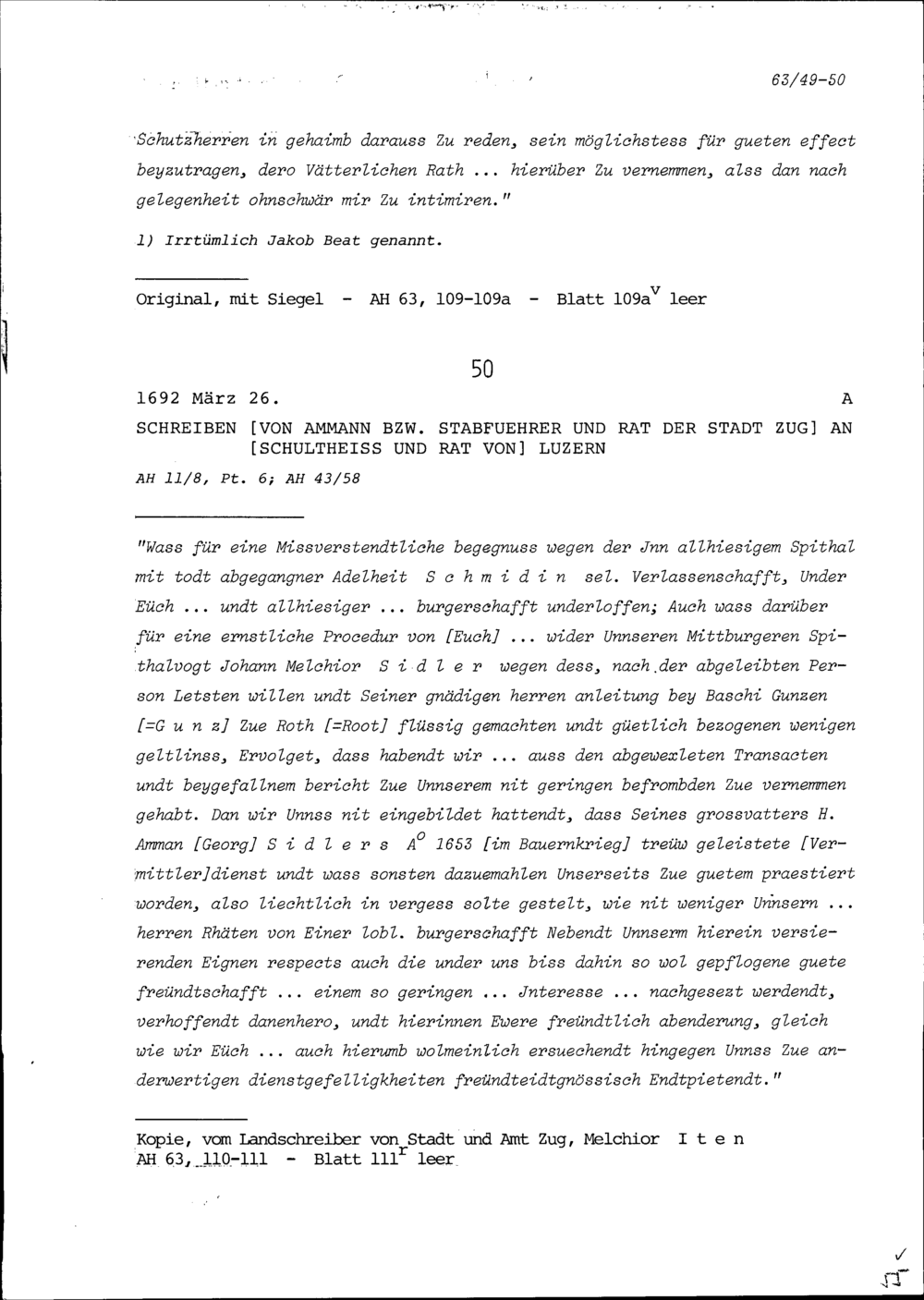 Schreiben des Ammanns (Stabführers) und Rats der Stadt Zug an Schultheiss und Rat...