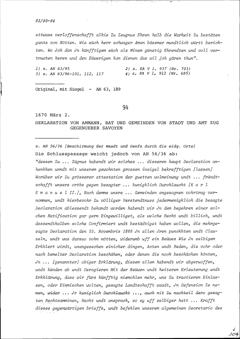 Deklaration des Ammanns, Rats und der Gemeinden von Stadt und Amt Zug gegenüber Savoyen...