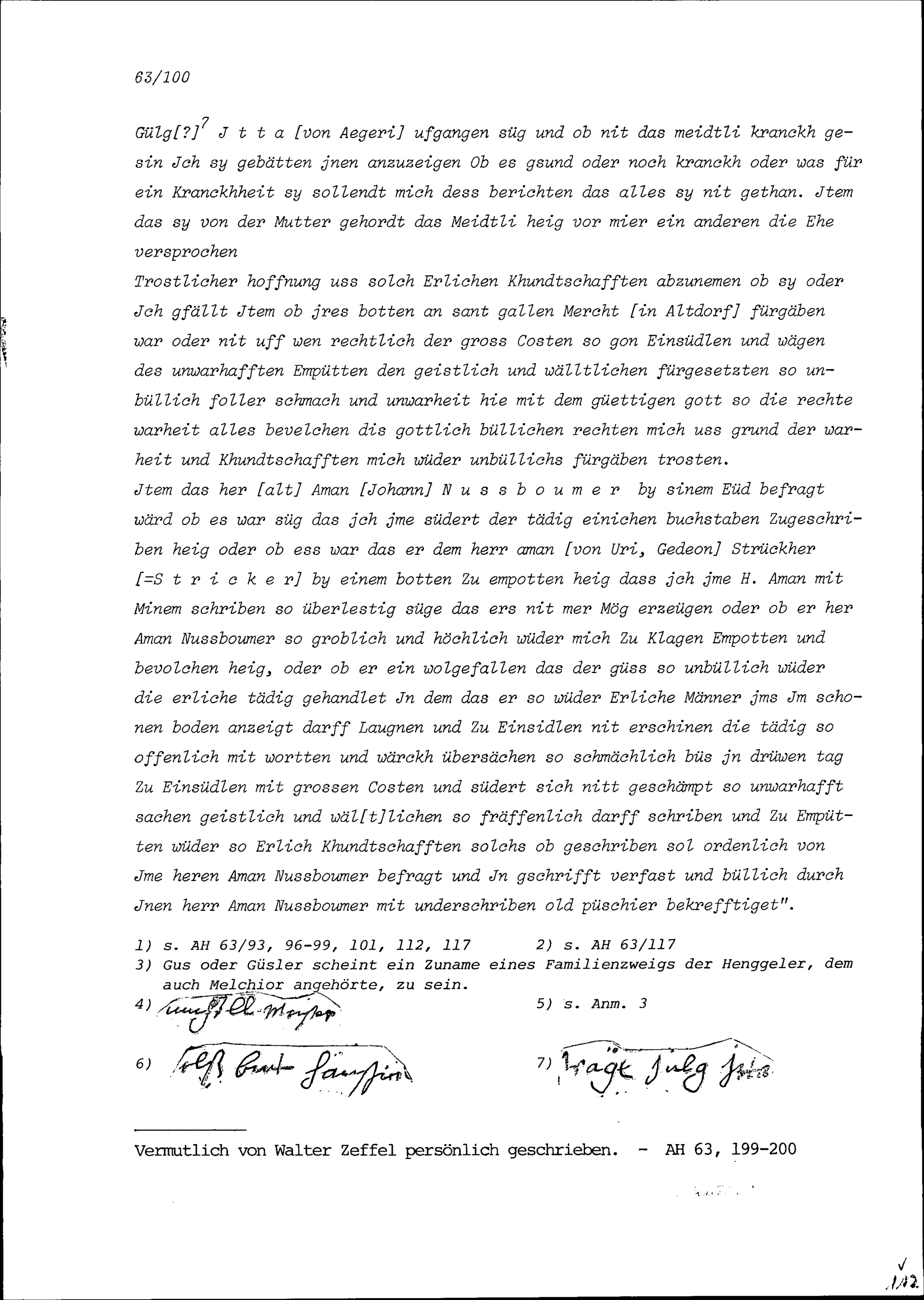 Kundschaftsaussagen von Walter Zeffel von Uri in Zusammenhang mit seinem Ehestreit mit Ottilia Henggeler von Ägeri