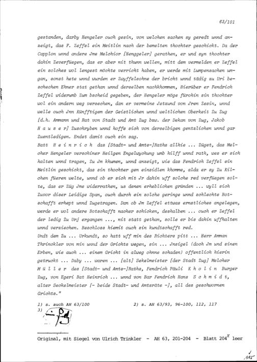 Kundschaftsaufnahmen im Ehestreit zwischen Walter Zeffel, Fähnrich, von Uri einerseits und Ottilia Henggeler von Ägeri anderseits