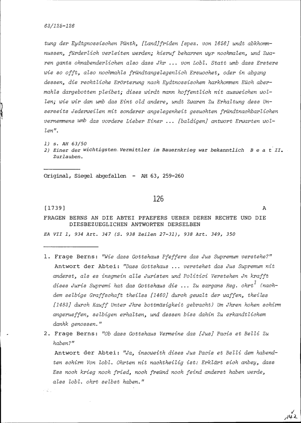 Fragen Berns an die Abtei Pfäfers über deren Rechte und die diesbezüglichen Antw...