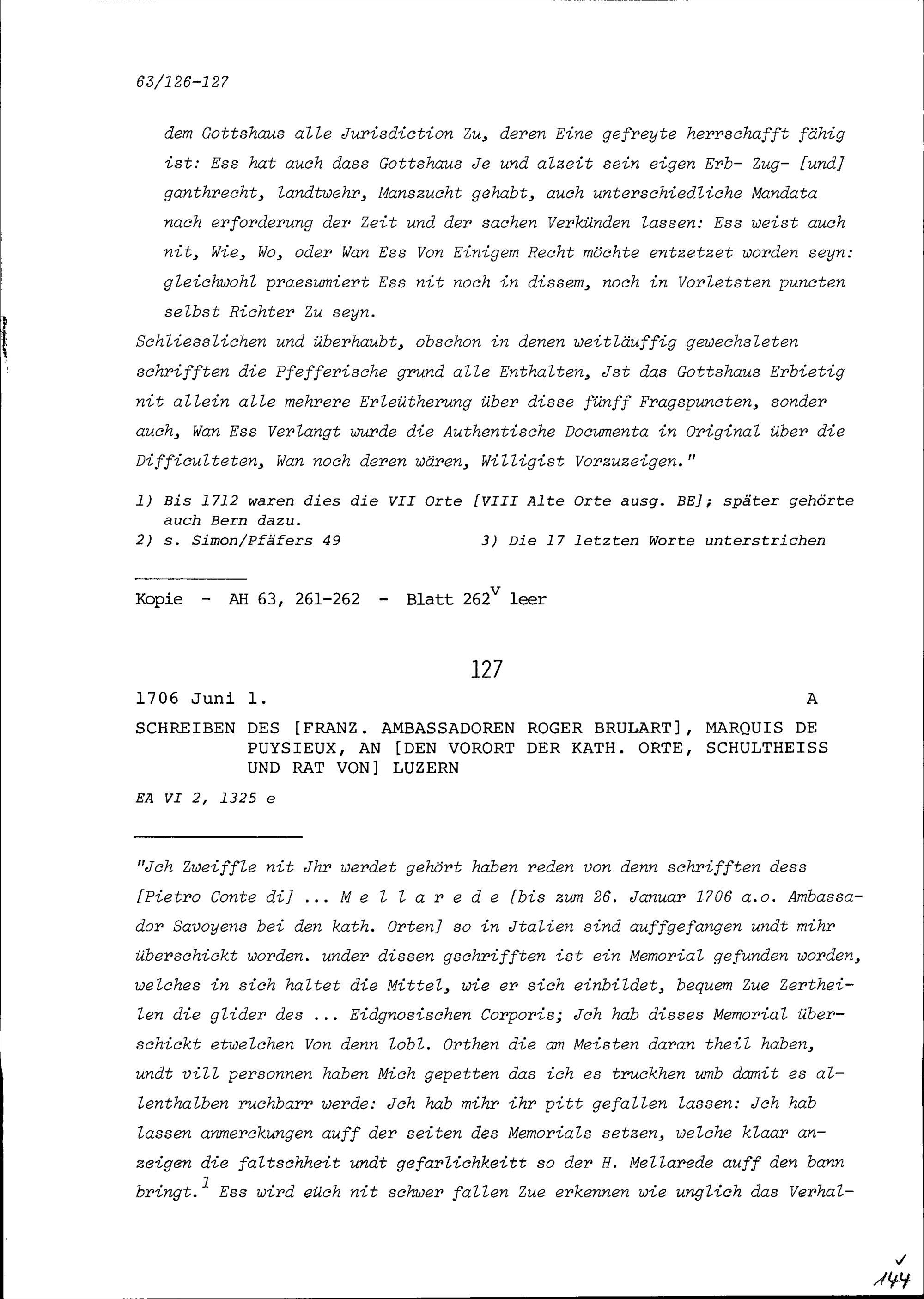Schreiben von Roger Brûlart, Marquis de Puysieux, Ambassador von Frankreich, an Vorort...
