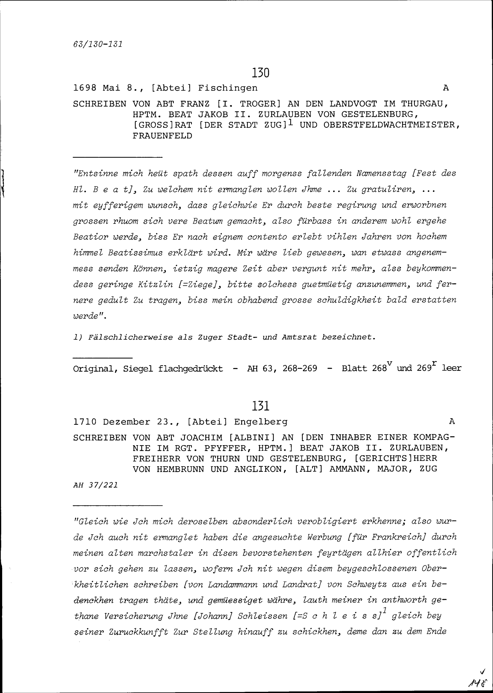 Schreiben von Franz I. Troger, Abt von Fischingen, an Beat Jakob II. Zurlauben, Landvogt im Thurgau und Hauptmann, Frauenfeld
