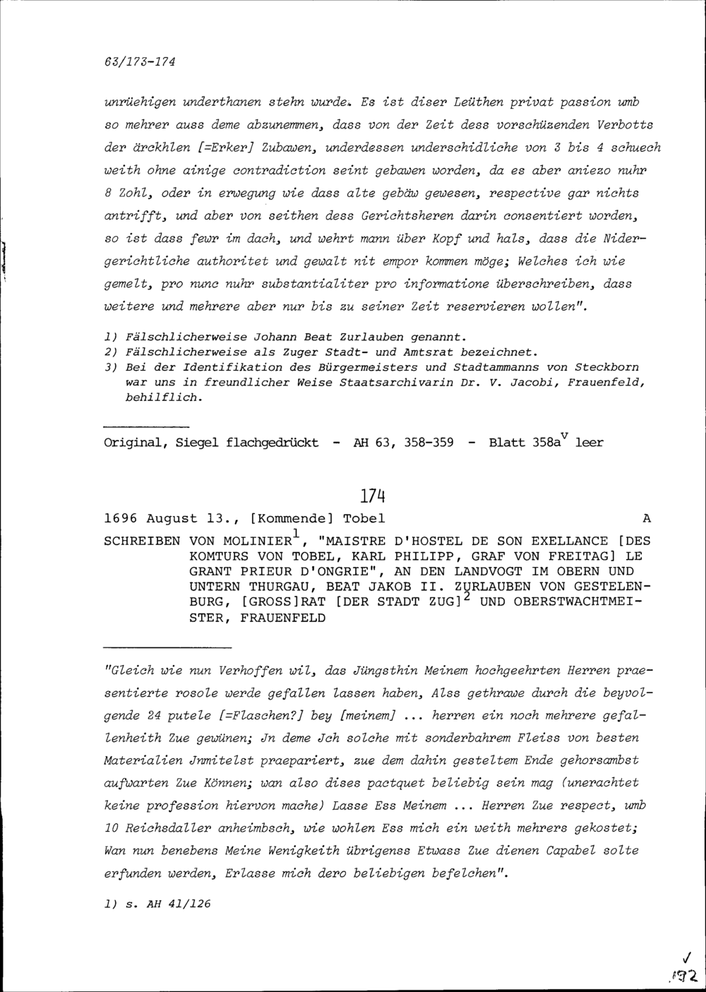 Schreiben von NN Molinier, Kellner des Komturs von Tobel Karl Philipp, Graf von Freytag, Grossprior von Ungarn, an Beat Jakob II. Zurlauben, Landvogt im Obern und Unteren Thurgau, Frauenfeld