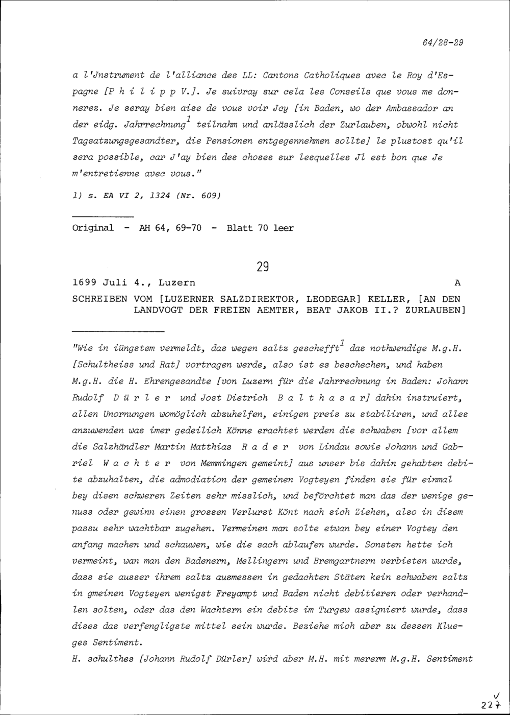 Schreiben von Leodegar Keller, Luzerner Salzdirektor, an Beat Jakob II. Zurlauben, Landvogt der Freien Ämter