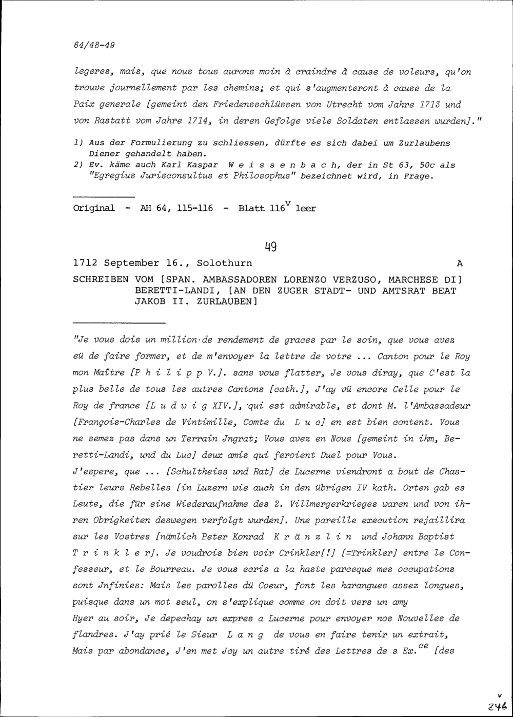 Schreiben von Lorenzo Verzuso, Marchese di Beretti-Landi, Ambassador von Spanien, an Beat Jakob II. Zurlauben, Stadt- und Amtrat Zug