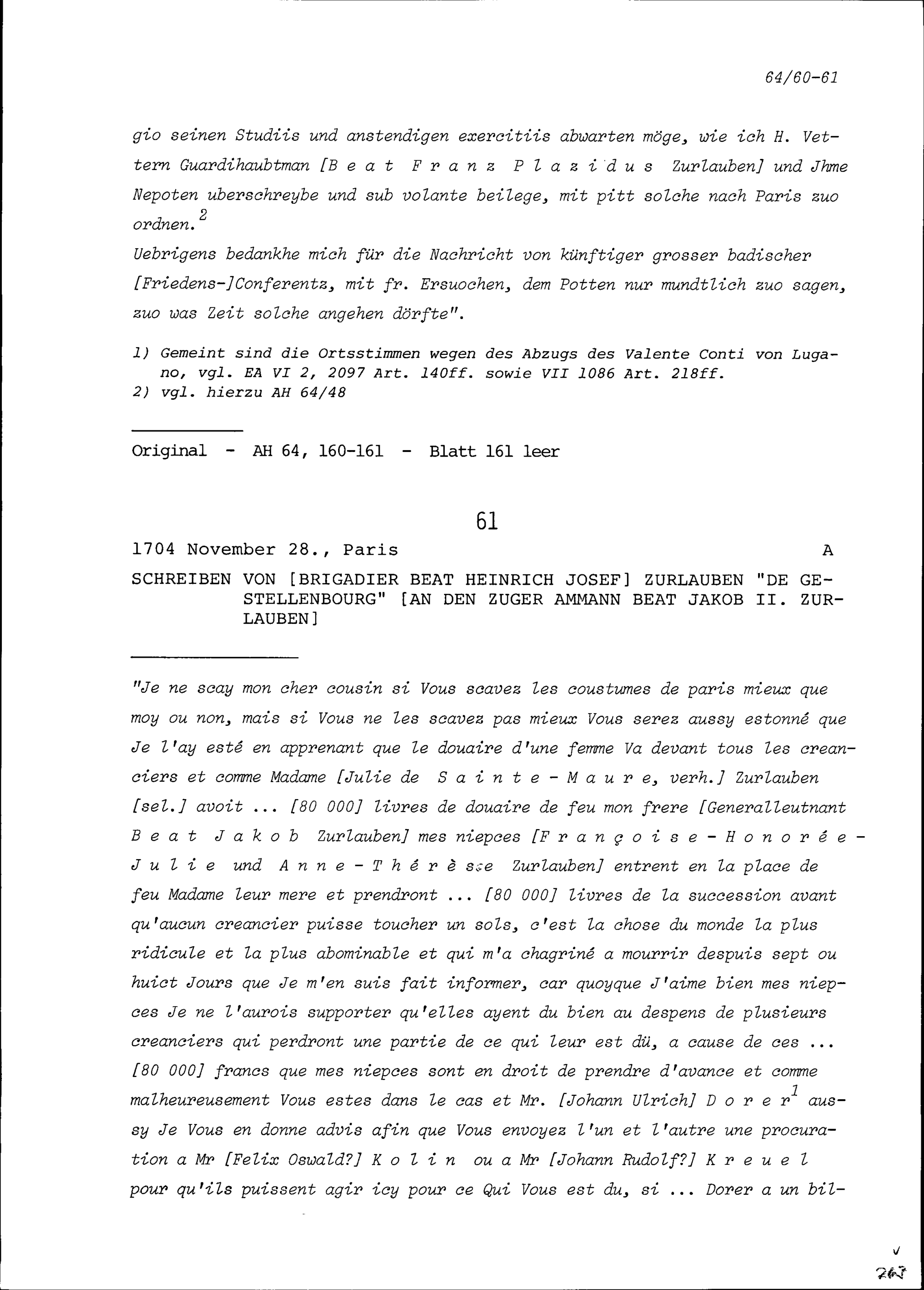Schreiben von Beat Heinrich Josef Zurlauben, Brigadier, an Beat Jakob II. Zurlauben, Ammann