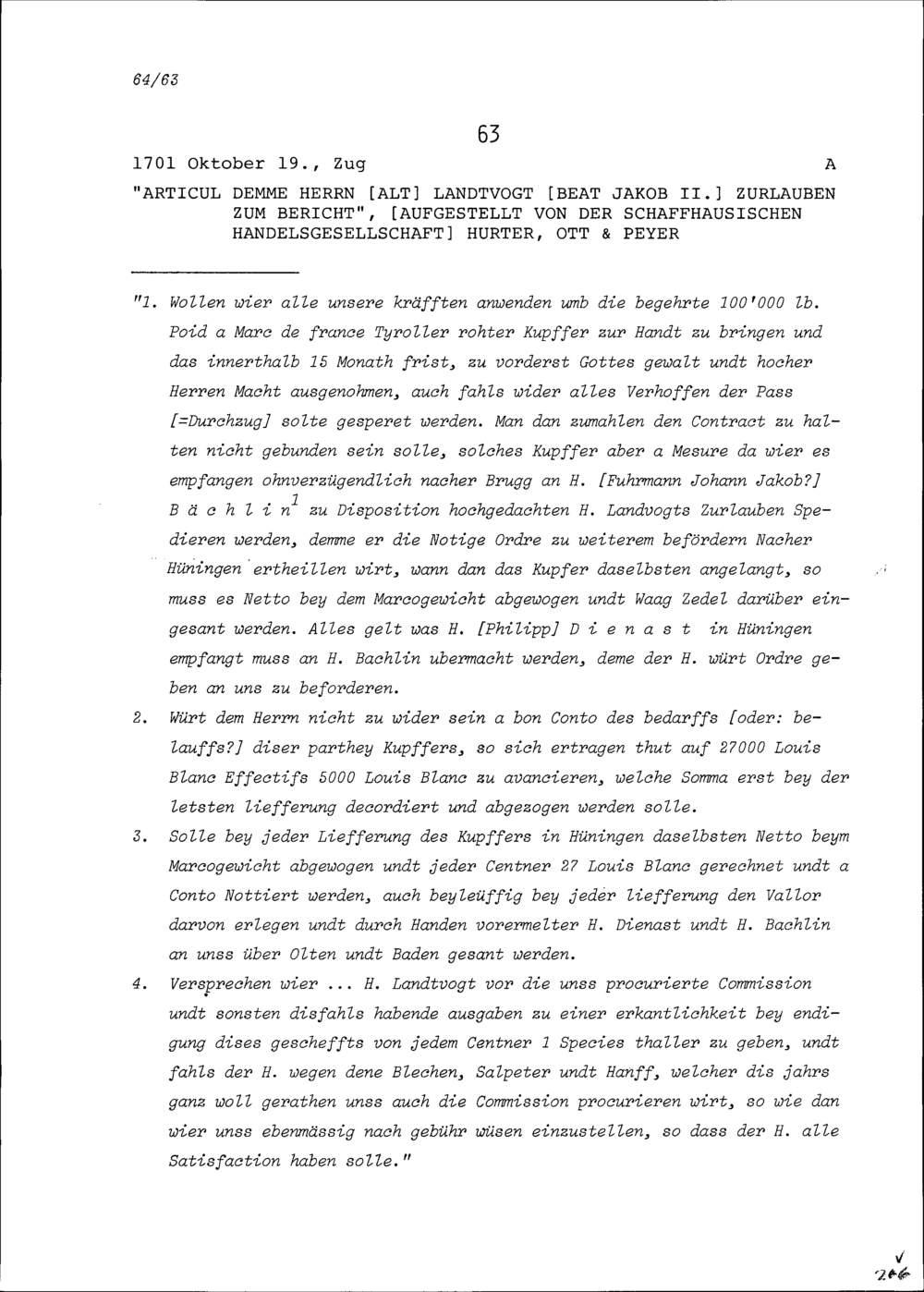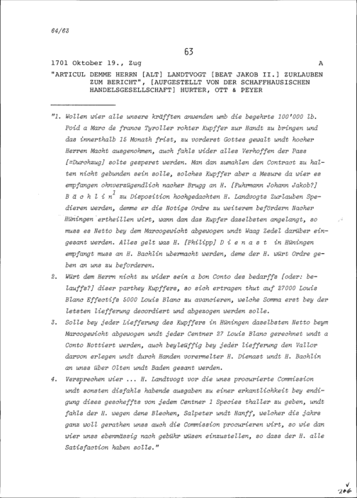 Notiz von Beat Jakob II. Zurlauben, Altlandvogt, zum Bericht der Schaffhausischen Handelsgesellschaft Hurter, Ott & Peyer in Sachen Kupferkauf