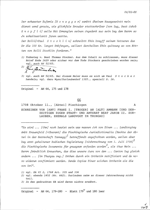 Schreiben von Franz I. Troger, Abt von Fischingen, an Beat Jakob II. Zurlauben, Altammann und Stadt- und Amtrat Zug, Altlandvogt im Thurgau