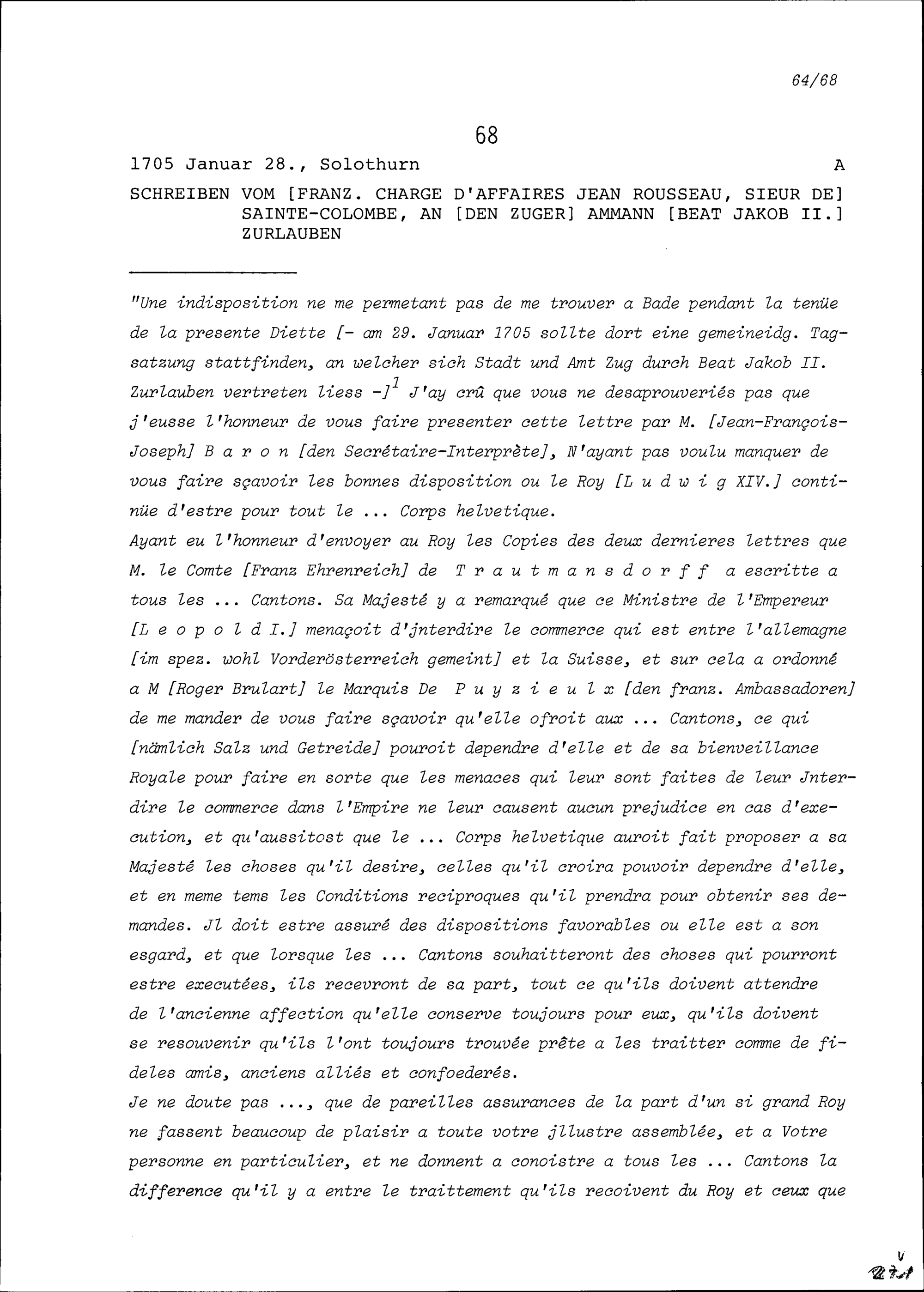Schreiben von Jean Rousseau, Sieur de Sainte-Colombe, französischer Geschäftsträger, an Beat Jakob II. Zurlauben, Ammann