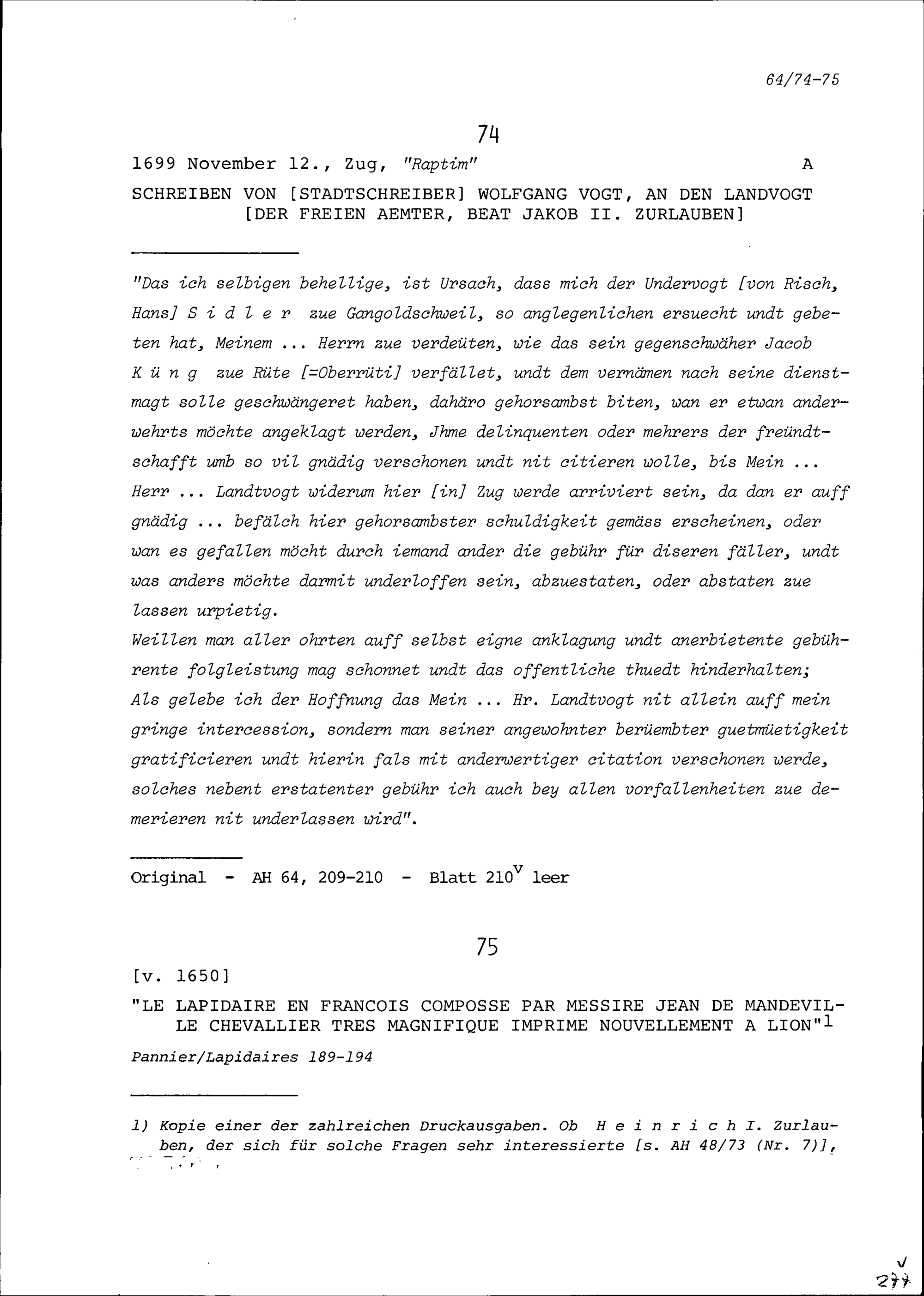 Schreiben von Wolfgang Vogt, Stadtschreiber, an Beat Jakob II. Zurlauben, Landvogt...