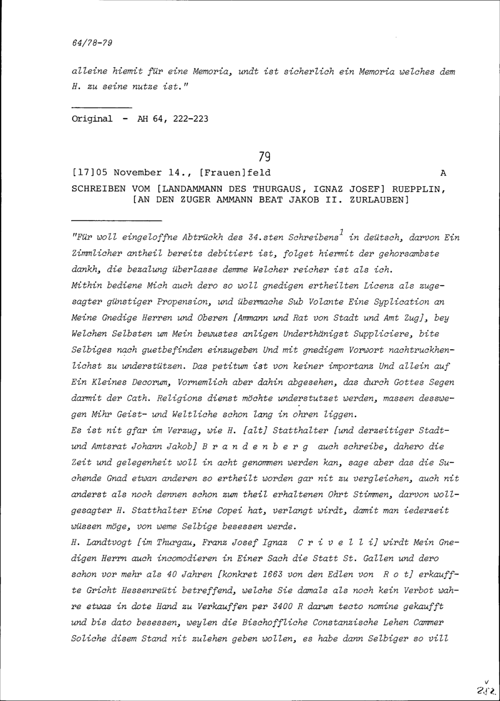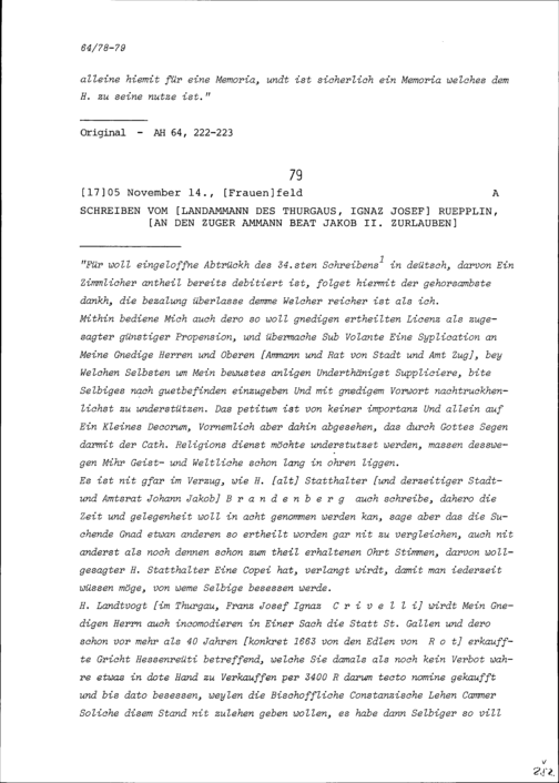 Schreiben von Ignaz Josef Rüpplin, Landammann des Thurgaus, an Beat Jakob II. Zurlauben, Ammann