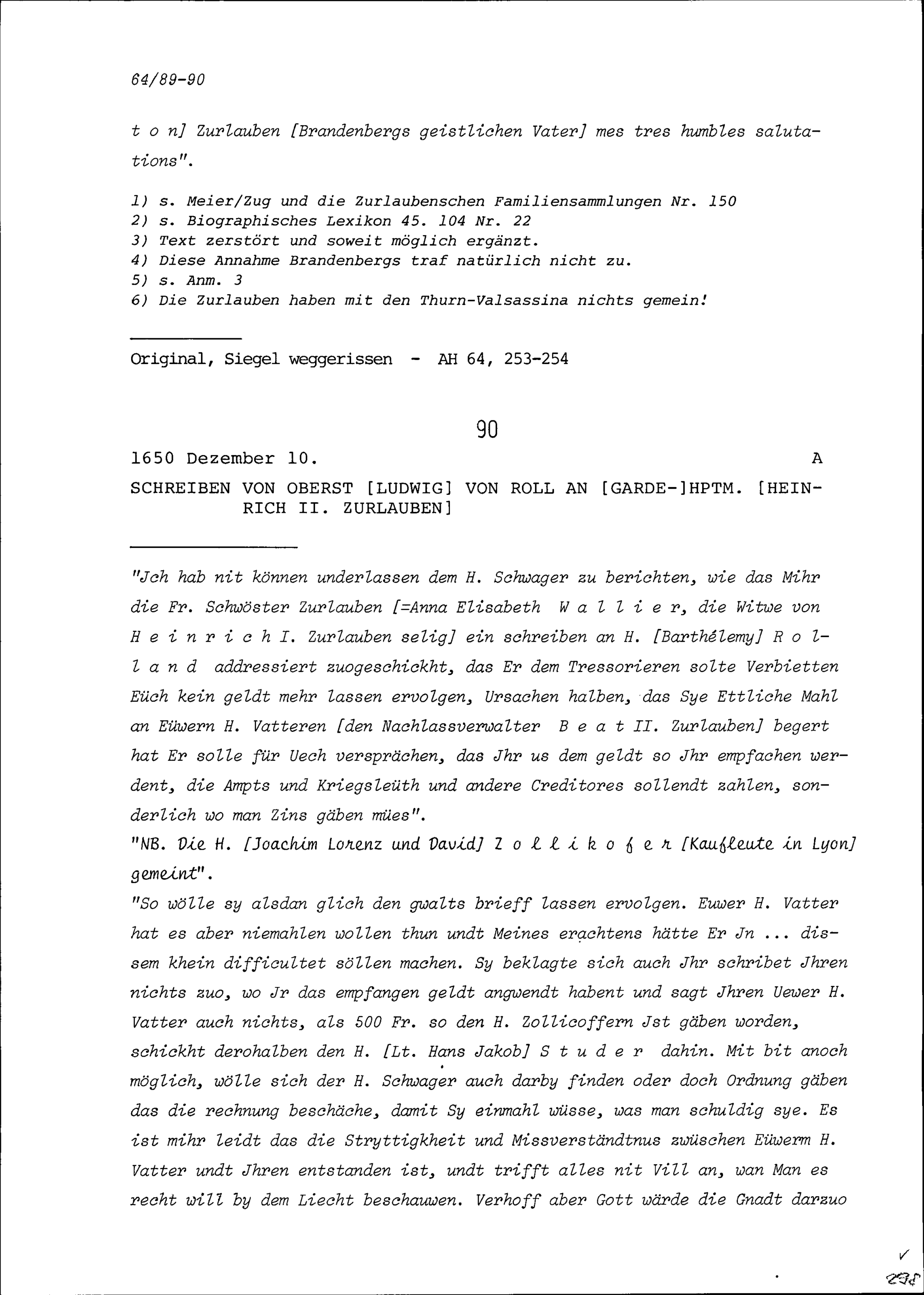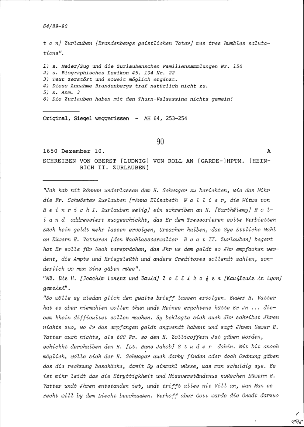 Schreiben von Ludwig von Roll, Oberst, an Heinrich II. Zurlauben, Gardehauptmann