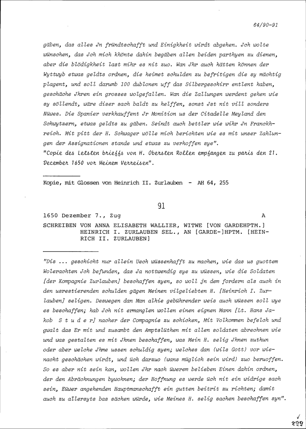 Schreiben von Anna Elisabeth Wallier, Witwe von Heinrich I. Zurlauben, Gardehauptmann, an Heinrich II. Zurlauben, Gardehauptmann