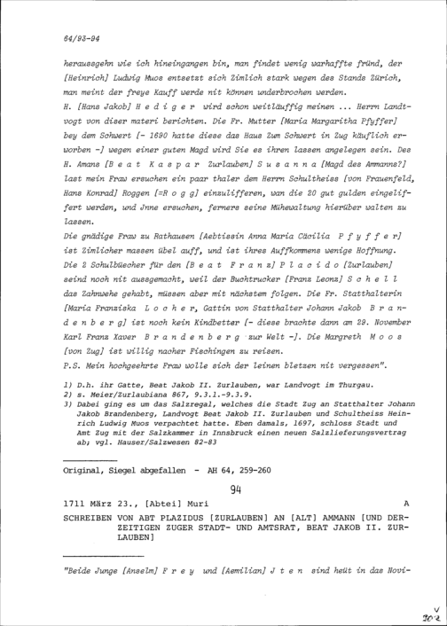 Schreiben von Plazidus Zurlauben, Abt, an Beat Jakob II. Zurlauben, Altammann und Stadt- und Amtrat Zug