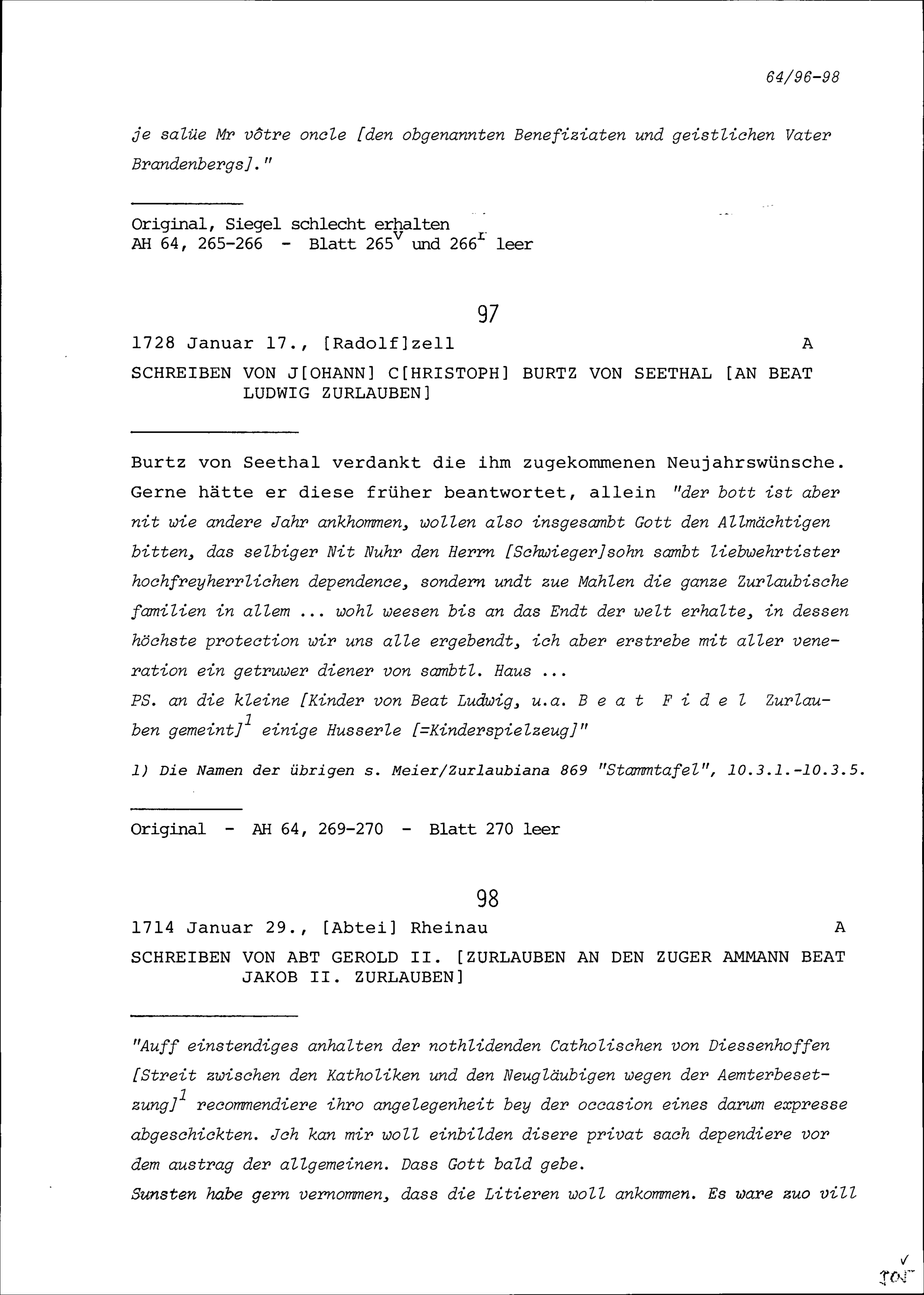 Schreiben von Johann Christoph Burtz von Seethal an Beat Ludwig Zurlauben