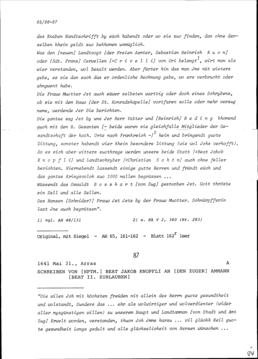 Schreiben von Beat Jakob Knopfli, Hauptmann, an Beat II. Zurlauben, Ammann Zug