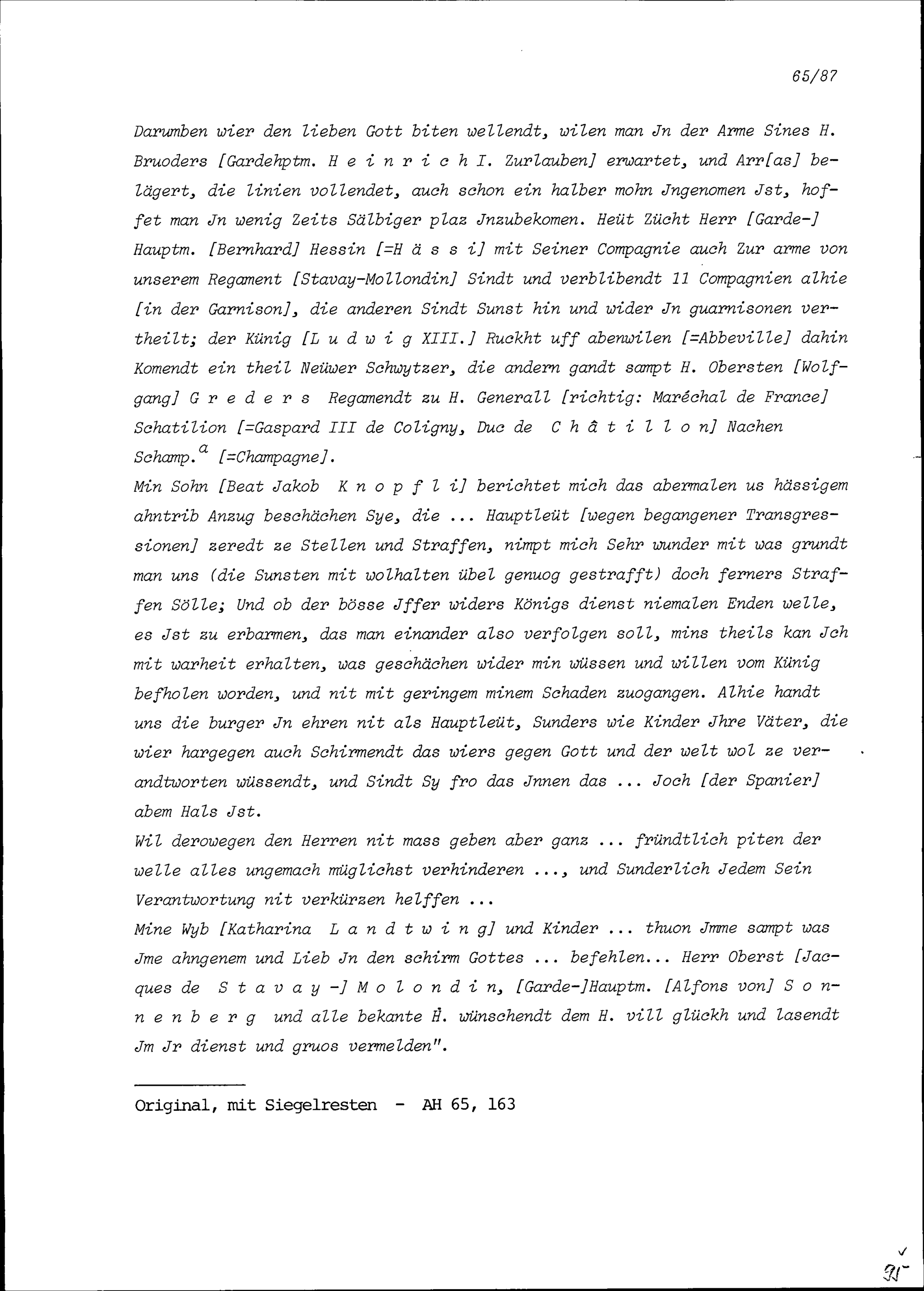 Schreiben von Beat Jakob Knopfli, Hauptmann, an Beat II. Zurlauben, Ammann Zug