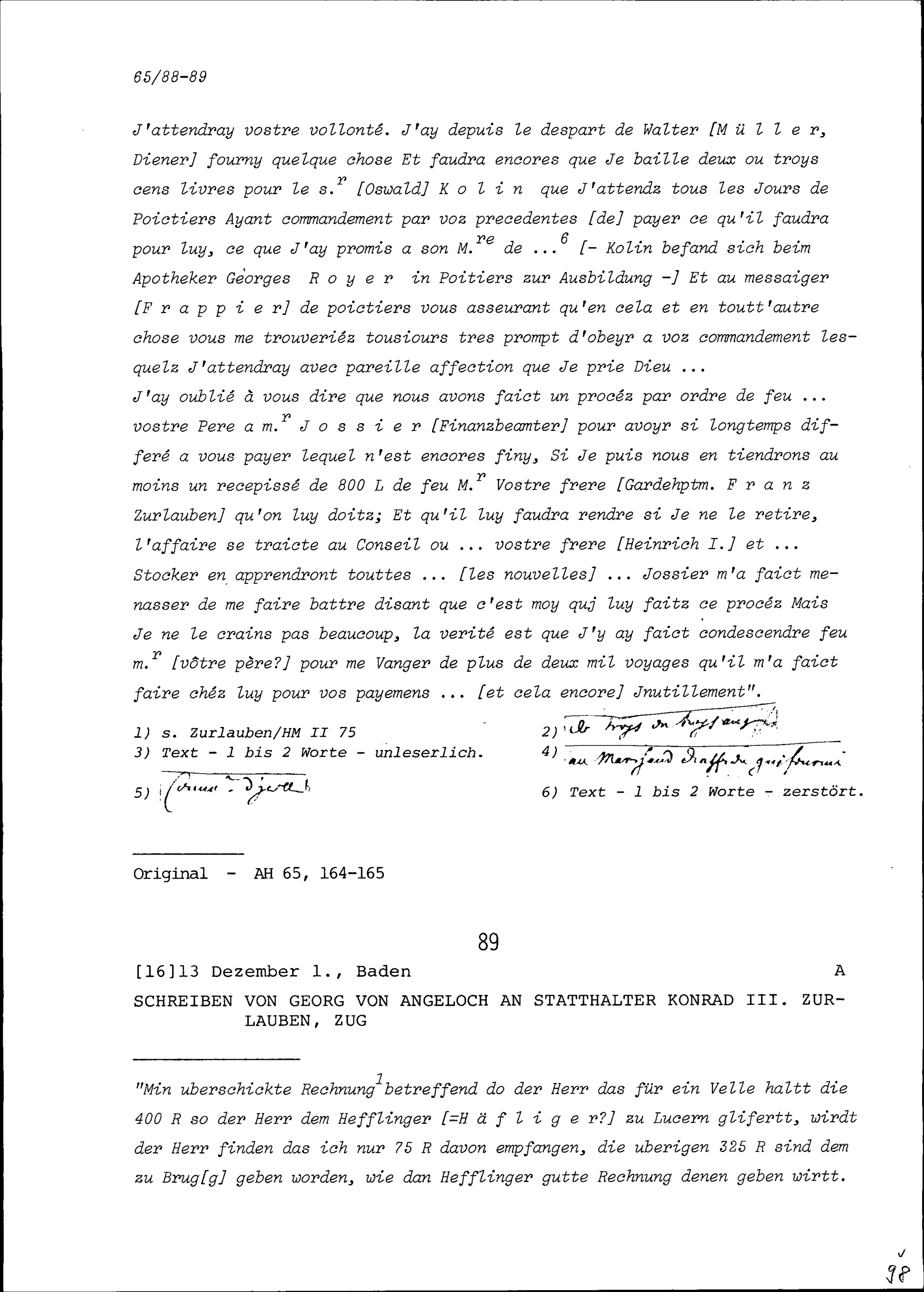 Schreiben von Georg von Angeloch an Konrad III. Zurlauben, Statthalter, Zug
