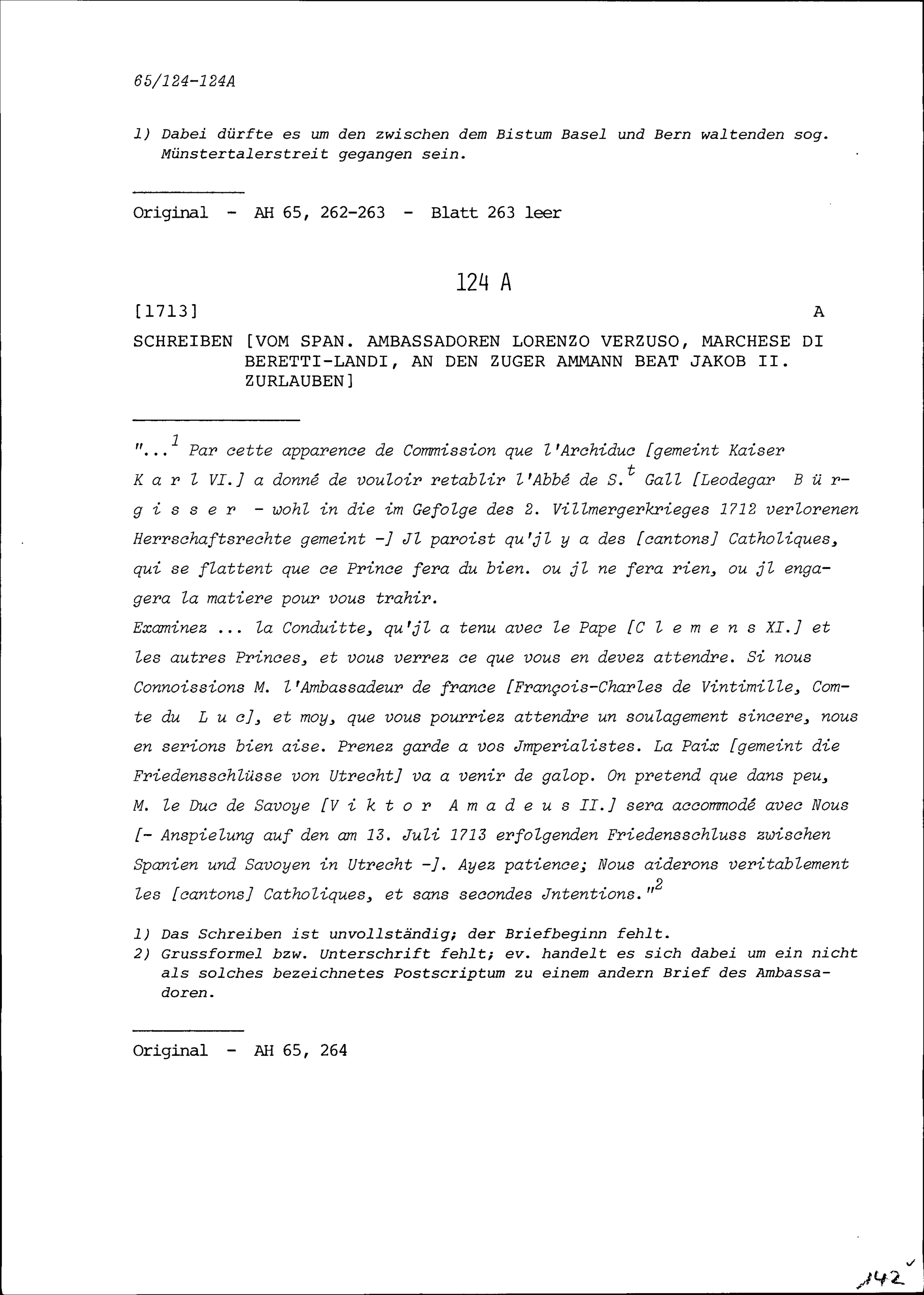 Schreiben von Lorenzo Verzuso, Marchese di Beretti-Landi, Ambassador von Spanien, an Beat Jakob II. Zurlauben, Ammann