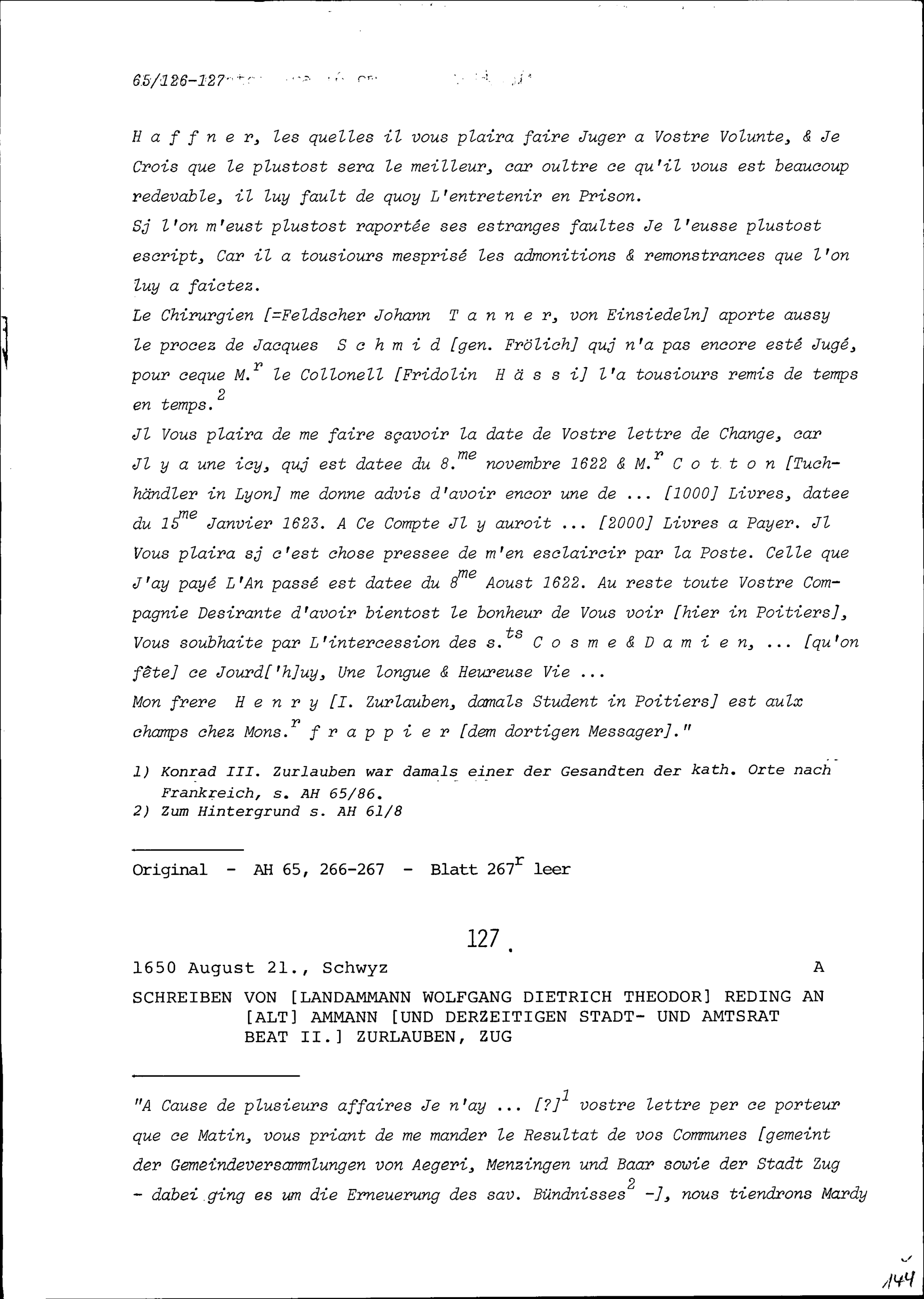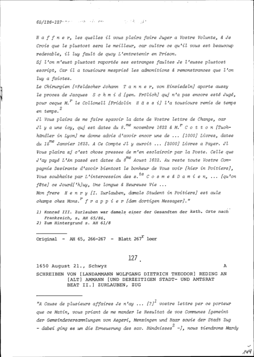Schreiben von Wolfgang Dietrich Theodor Reding, Landammann, an Beat II. Zurlauben, Altammann und Stadt- und Amtrat, Zug