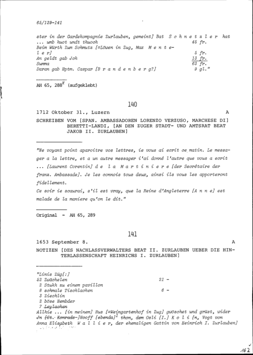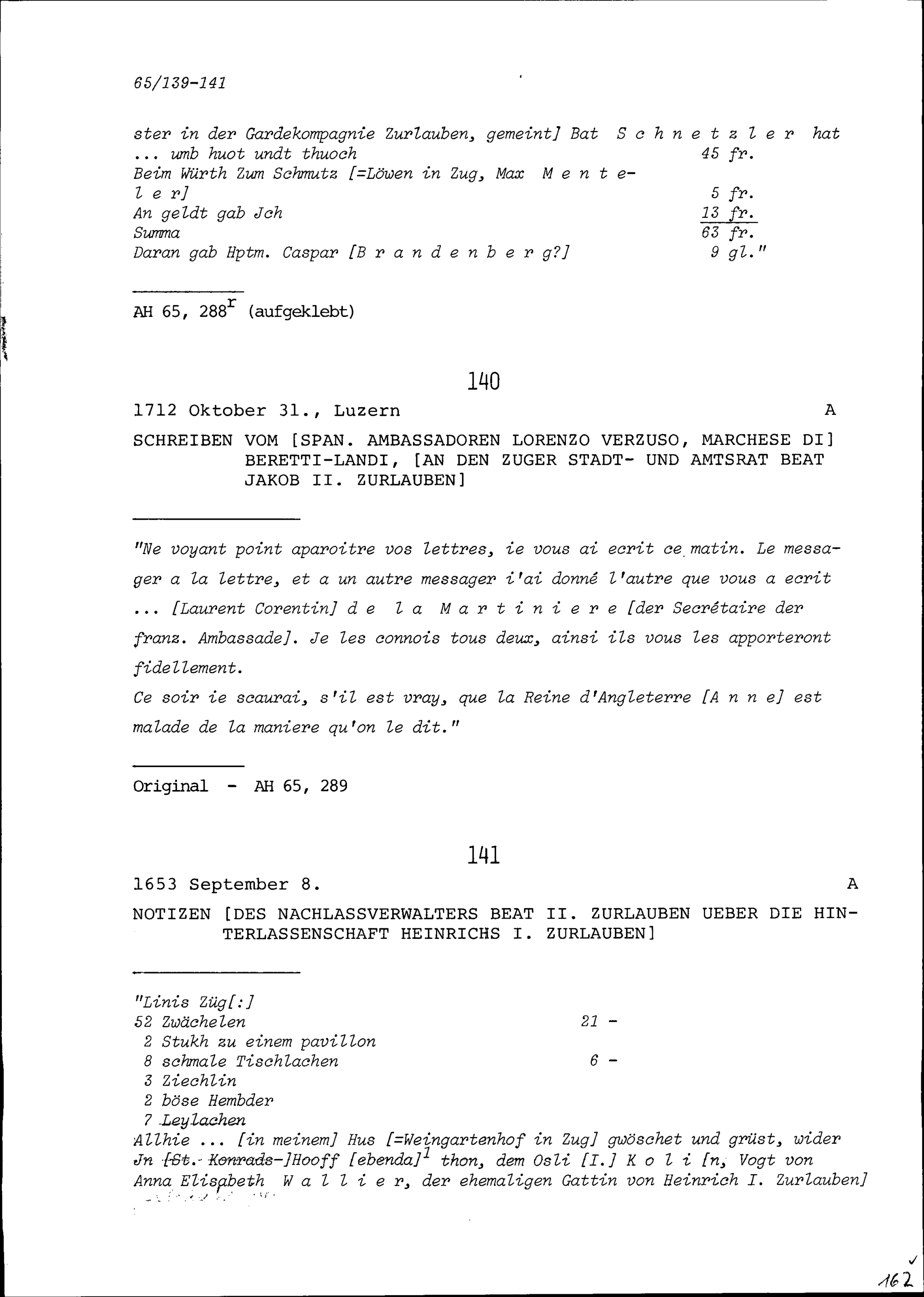 Schreiben von Lorenzo Verzuso, Marchese di Beretti-Landi, Ambassador von Spanien, an Beat Jakob II. Zurlauben, Stadt- und Amtrat Zug
