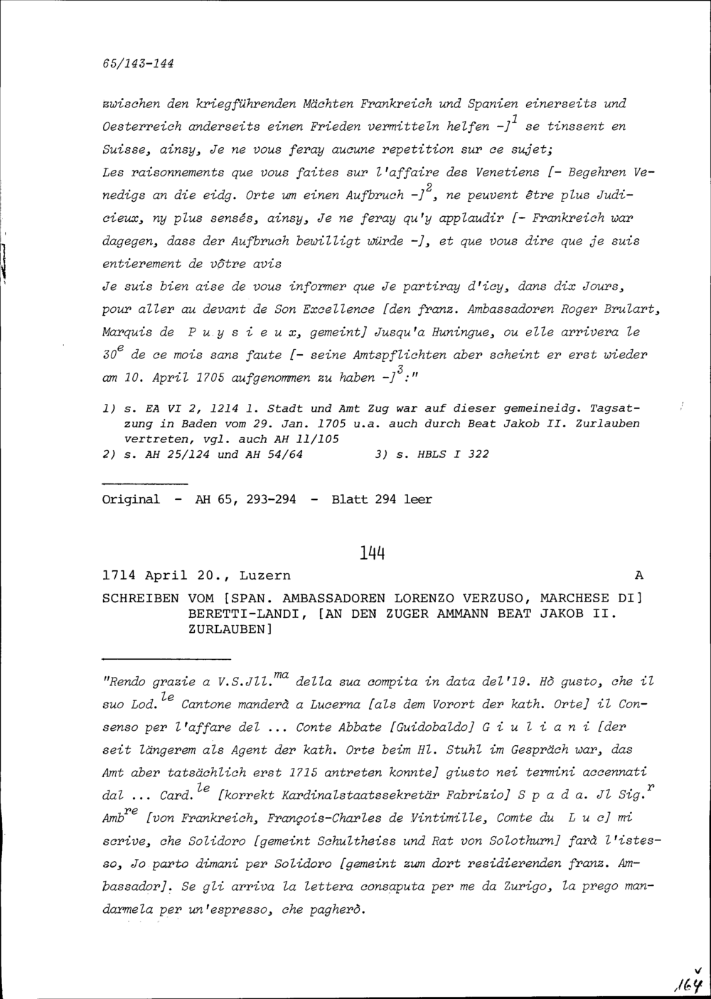 Schreiben von Lorenzo Verzuso, Marchese di Beretti-Landi, Ambassador von Spanien, an Beat Jakob II. Zurlauben, Ammann