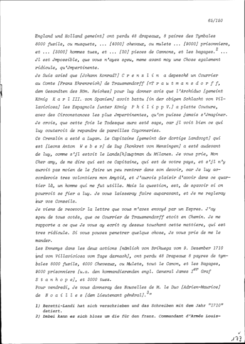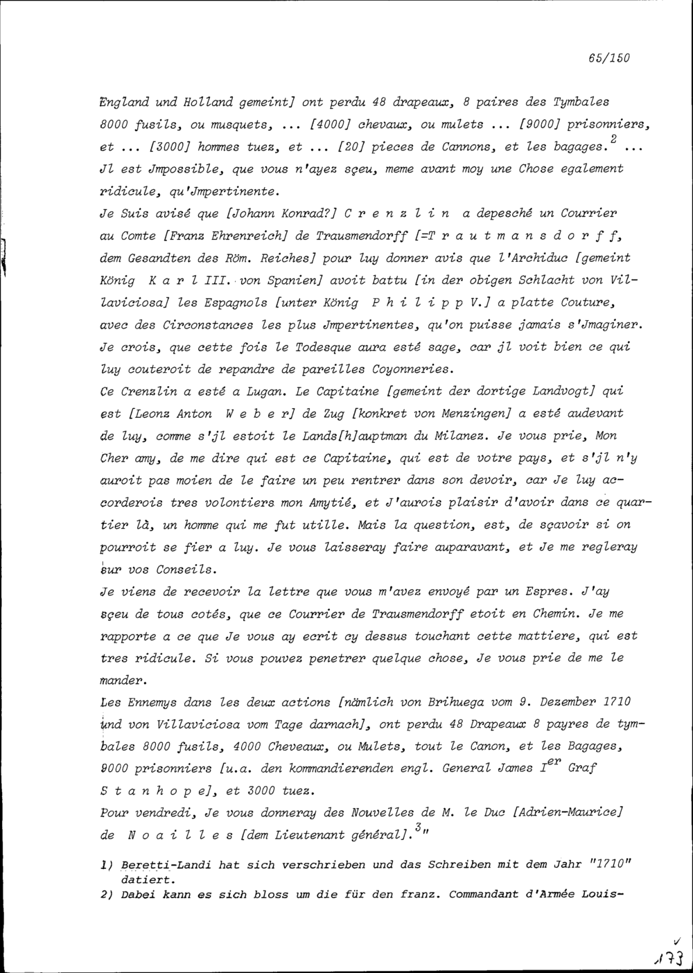 Schreiben von Lorenzo Verzuso, Marchese di Beretti-Landi, Ambassador von Spanien, an Beat Jakob II. Zurlauben, Stadt- und Amtrat Zug