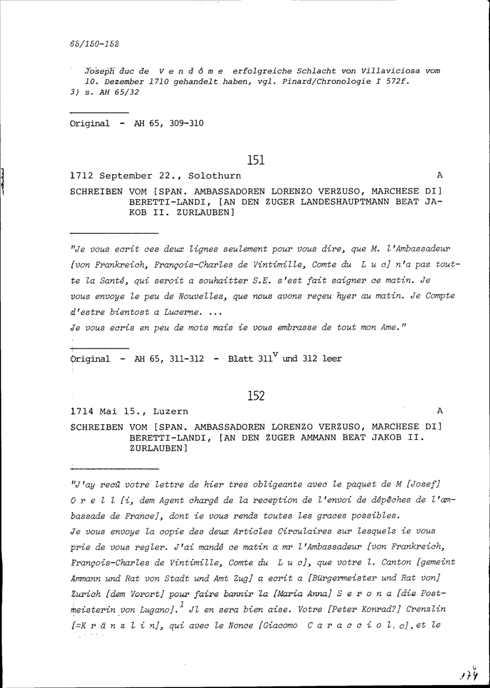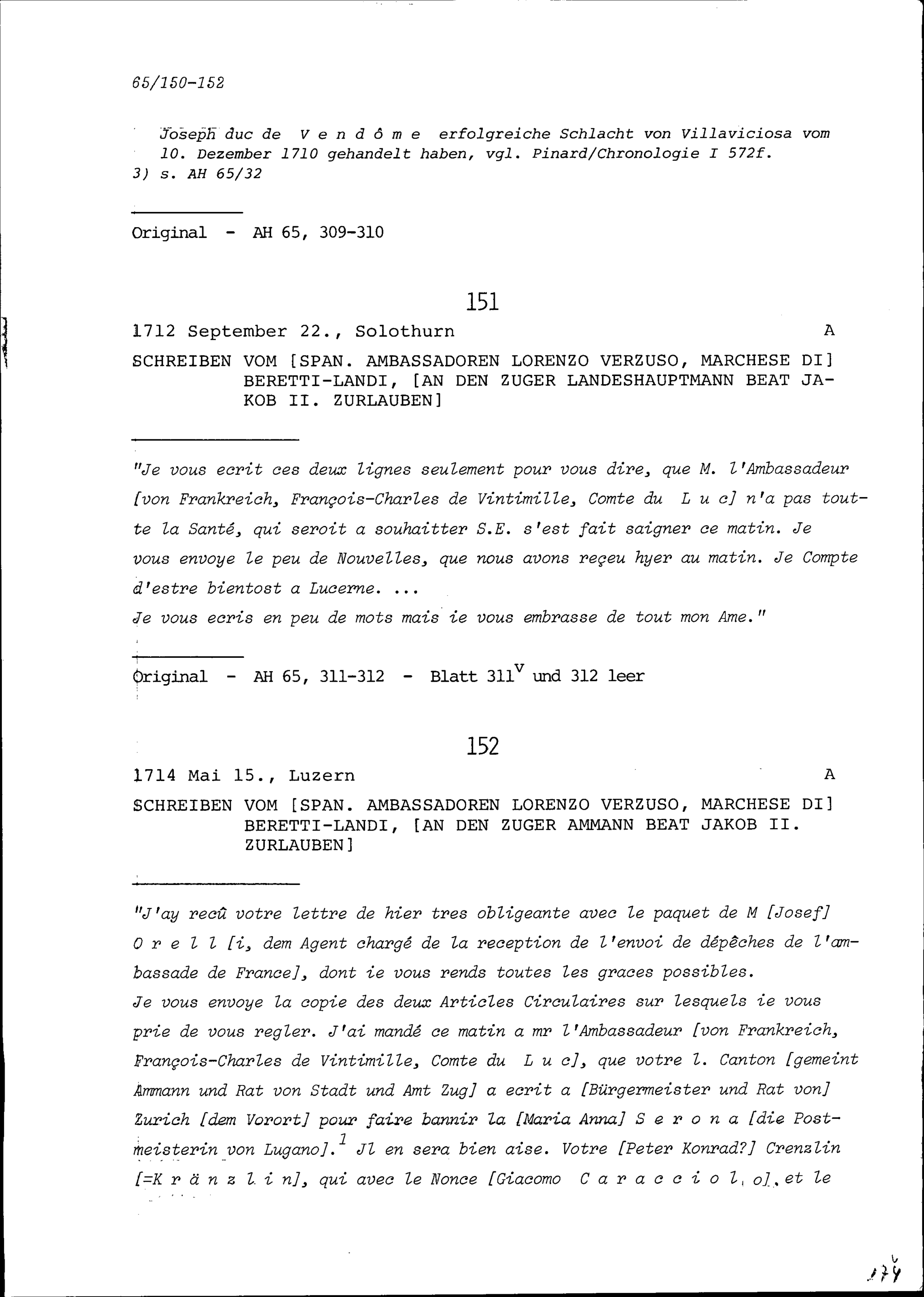 Schreiben von Lorenzo Verzuso, Marchese di Beretti-Landi, Ambassador von Spanien, an Beat Jakob II. Zurlauben, Zuger Landeshauptmann
