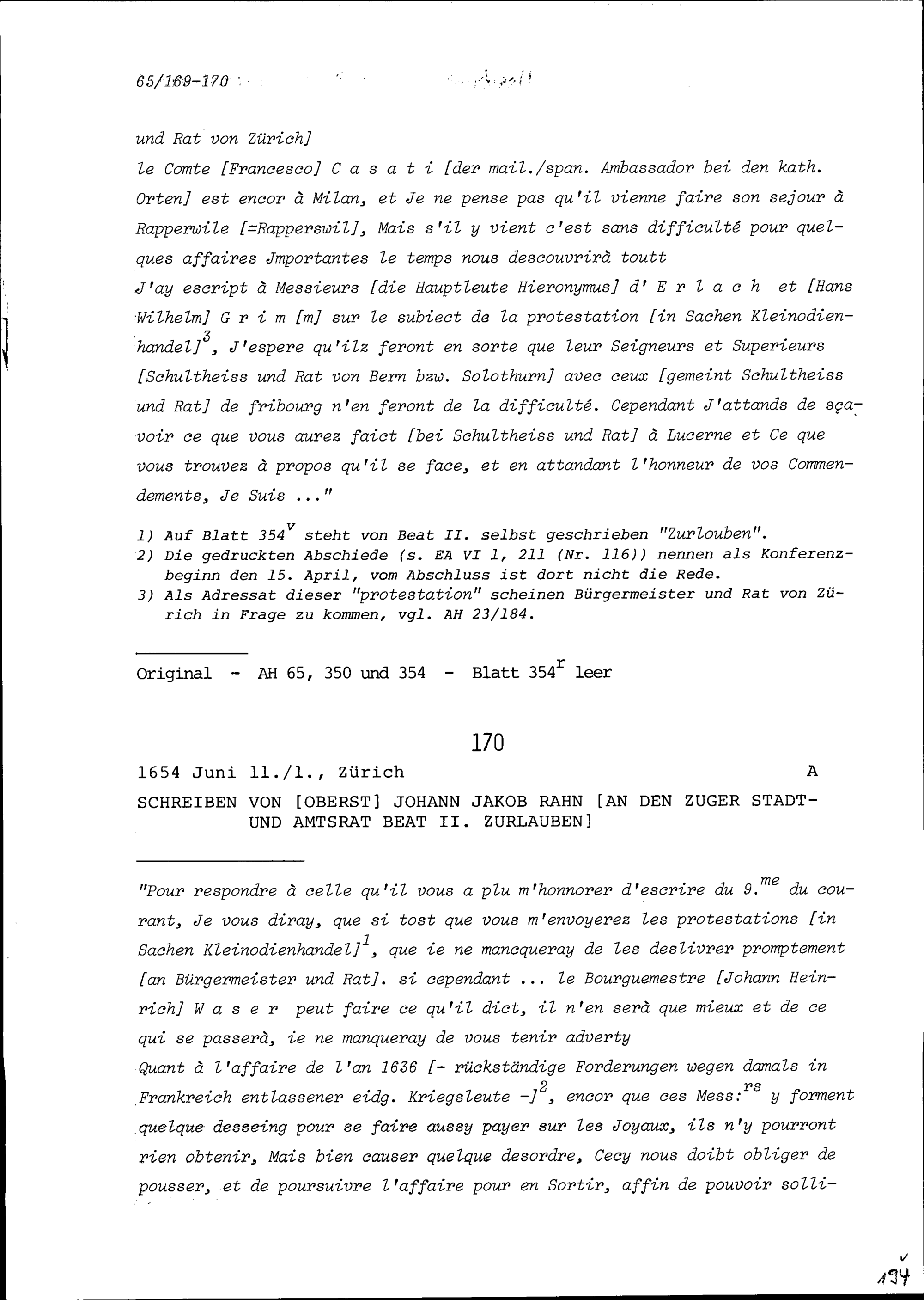 Schreiben von Johann Jakob Rahn, Oberst, an Beat II. Zurlauben, Stadt- und Amtrat...