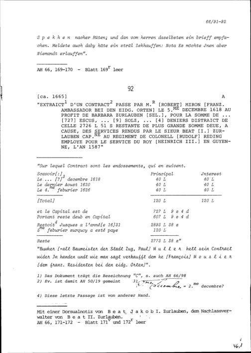 Zahlungen von 1618 bis 1631 basierend auf einem Kontrakt ausgestellt durch Robert Miron, Ambassador von Frankreich, am 5. Dezember 1618 für Barbara Zurlauben, selig, beziehungsweise die Kompanie von Beat I. Zurlauben im Regiment Rudolf Reding