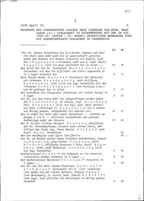 Rechnung von Joachim Merz, Ochsenwirt, zuhanden von Beat Jakob II. Zurlauben, Hauptmann, in Zusammenhang mit den in Zug vom 20. Januar bis 25. März getätigten Werbungen für die Gardekompanie Zurlauben in Frankreich