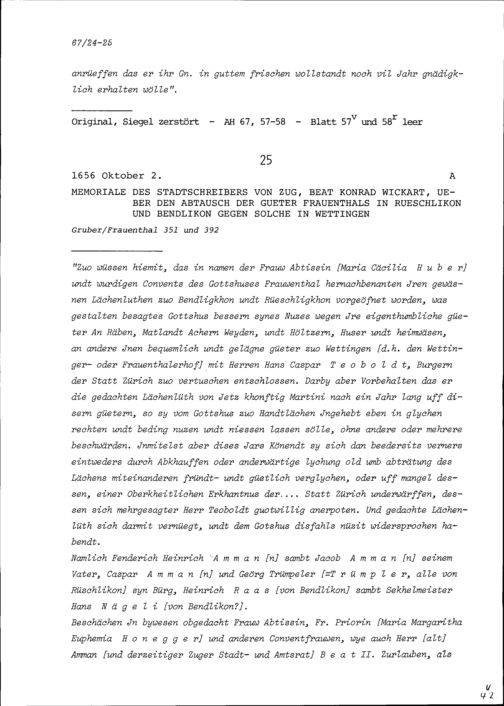 Bericht von Beat Konrad Wickart, Stadtschreiber von Zug, über den Abtausch der Güter des Frauenklosters Frauenthal in Rüschlikon und Bendlikon gegen solche in Wettingen