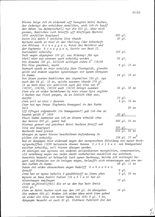 Abrechnung von Beat II. Zurlauben mit Melchior Honegger, Gastwirt zum Engel in Bremgarten