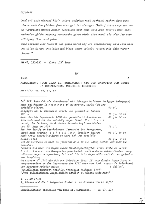Abrechnung von Beat II. Zurlauben mit Melchior Honegger, Gastwirt zum Engel, in Bremgarten