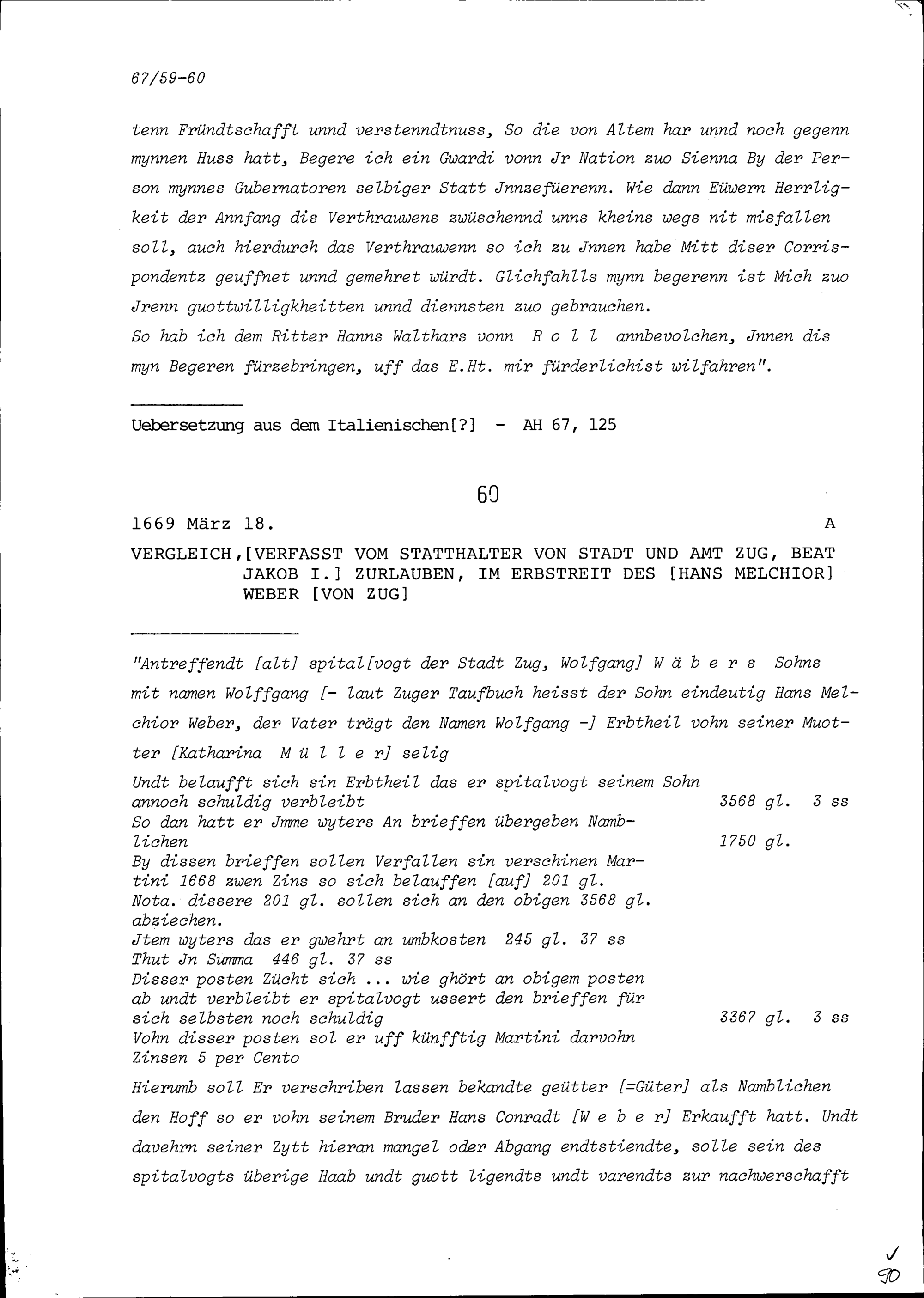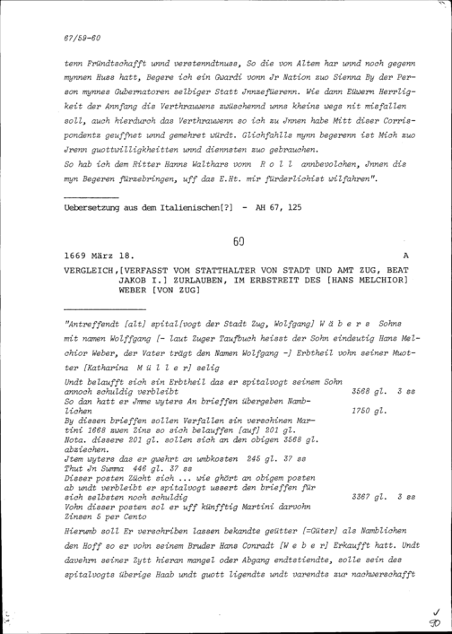 Vergleich im Erbstreit von Hans Melchior Weber von Zug, verfasst von Beat Jakob I. Zurlauben, Statthalter von Stadt und Amt Zug