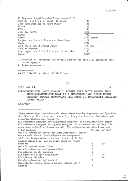 Abrechnung von Oswald I. Kolin, Vogt, für Beat II. Zurlauben, Altammann und Nachlassverwalter von Heinrich I. Zurlauben