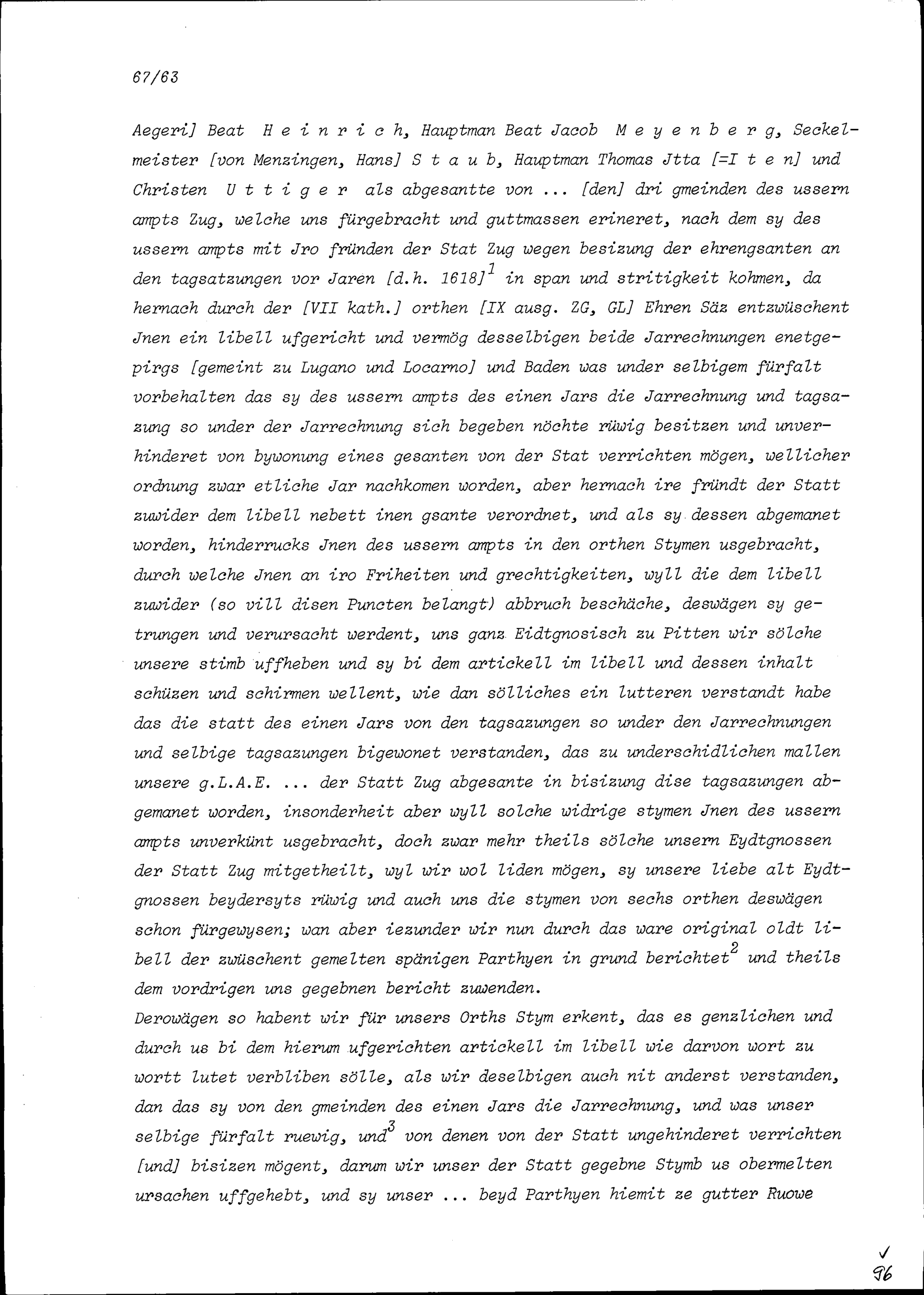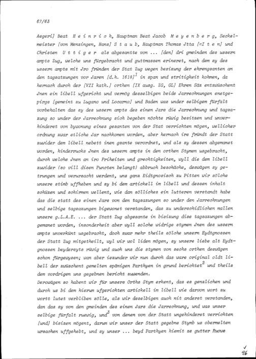 Ratsbeschluss des Landammanns und Landrats Uri im Streit der Drei Gemeinden des Äusseren Amts (Ägeri, Menzingen und Baar) mit der Stadt Zug wegen des Beisitzes auf den Jahrrechnungen (Libellhandel)